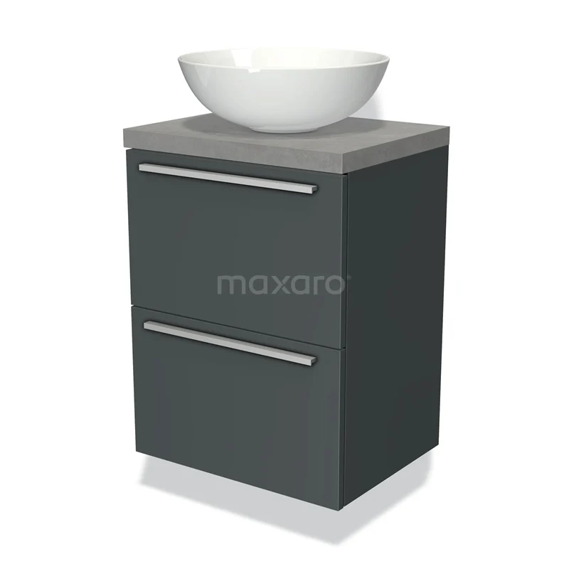 Modulo Plato Slim Badmöbel mit Aufsatzwaschbecken | 50 cm Dunkelgrau Flach front Hellgrauer Beton blatt 2 übereinanderliegende Schubladen