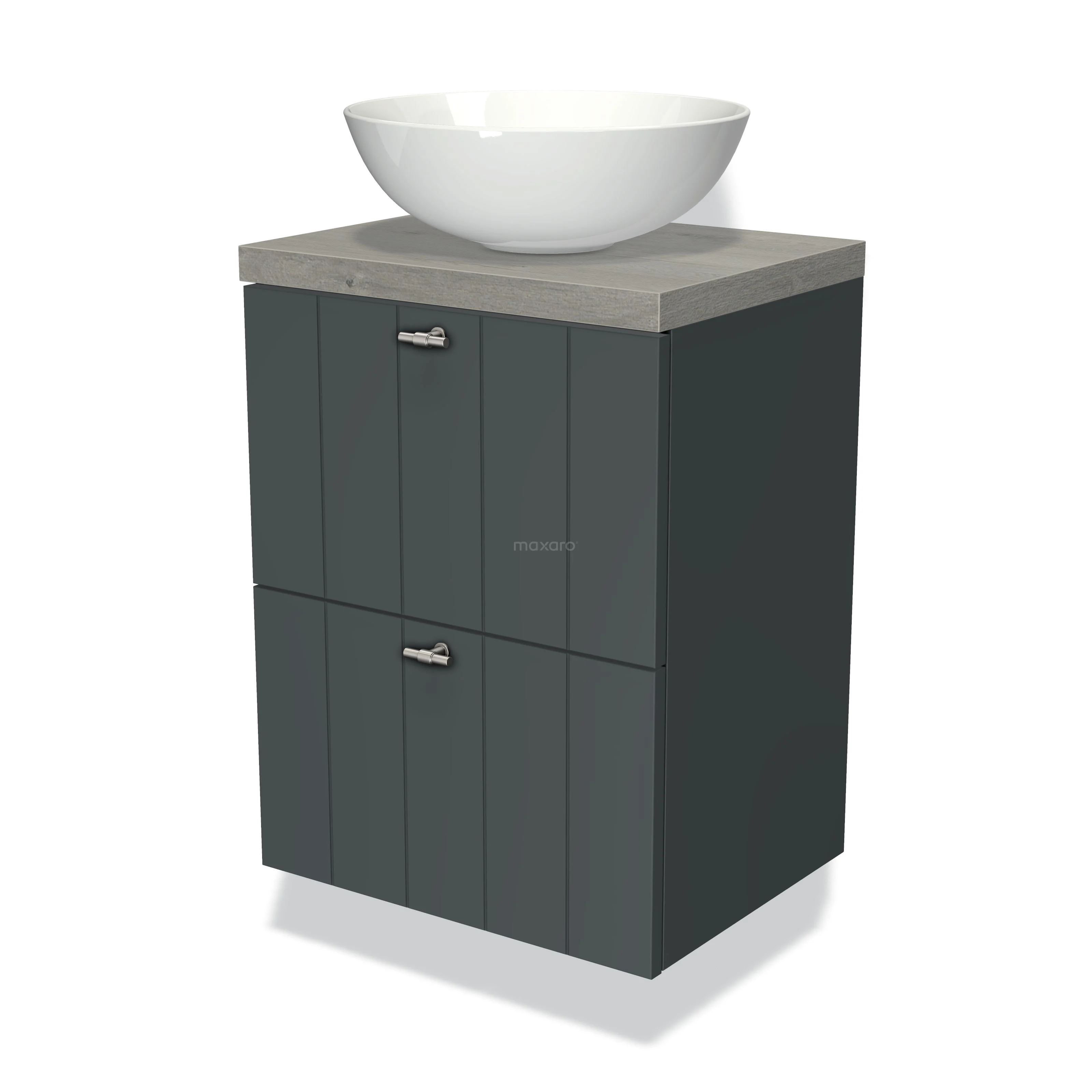 Modulo Plato Slim Badmöbel mit Aufsatzwaschbecken | 50 cm Dunkelgrau Lamelle front Graue Eiche blatt 2 übereinanderliegende Schubladen