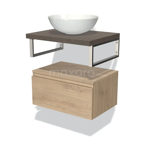 Badmöbel für Aufsatzwaschbecken 60 cm Modulo Plato Hellbraune Eiche 1 Schublade Grifflos Dunkelbraune Eiche Platte