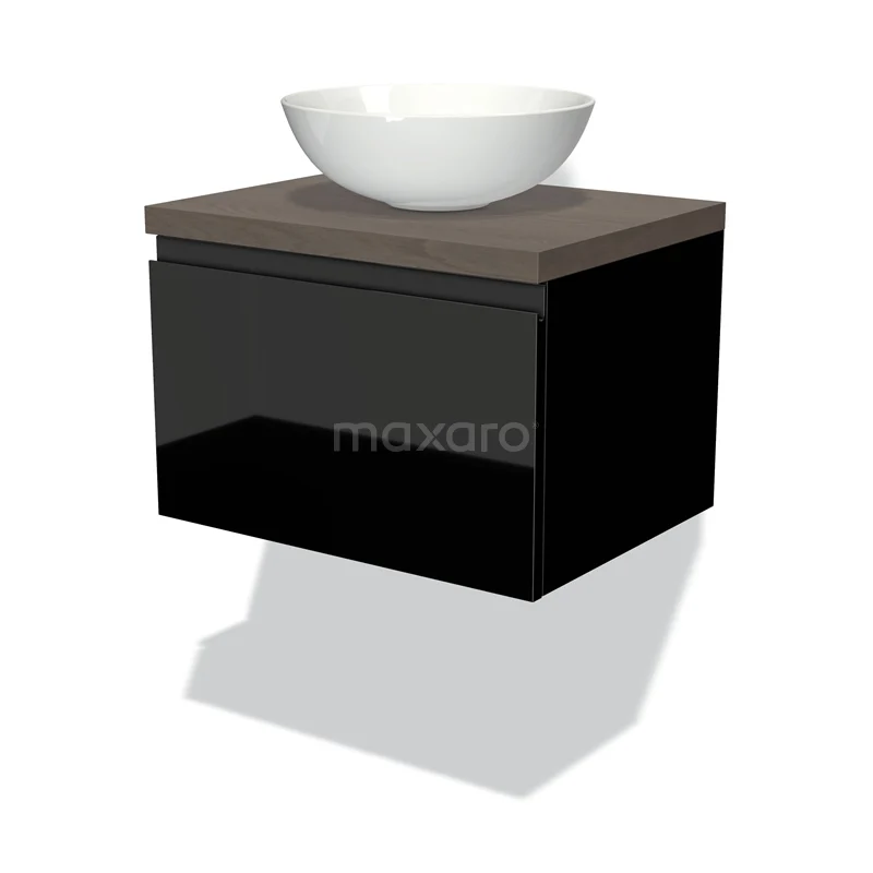 Badmöbel für Aufsatzwaschbecken 60cm Modulo Plato Hochglanz Schwarz 1 Schublade grifflos dunkelbraune Eiche Platte