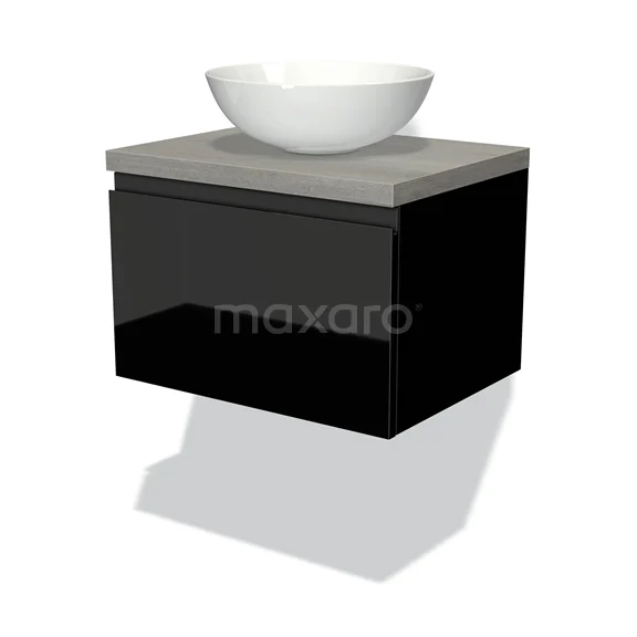 Badmöbel für Aufsatzwaschbecken 60cm Modulo Plato Hochglanz Schwarz 1 Schublade Grifflos Graue Eiche Platte