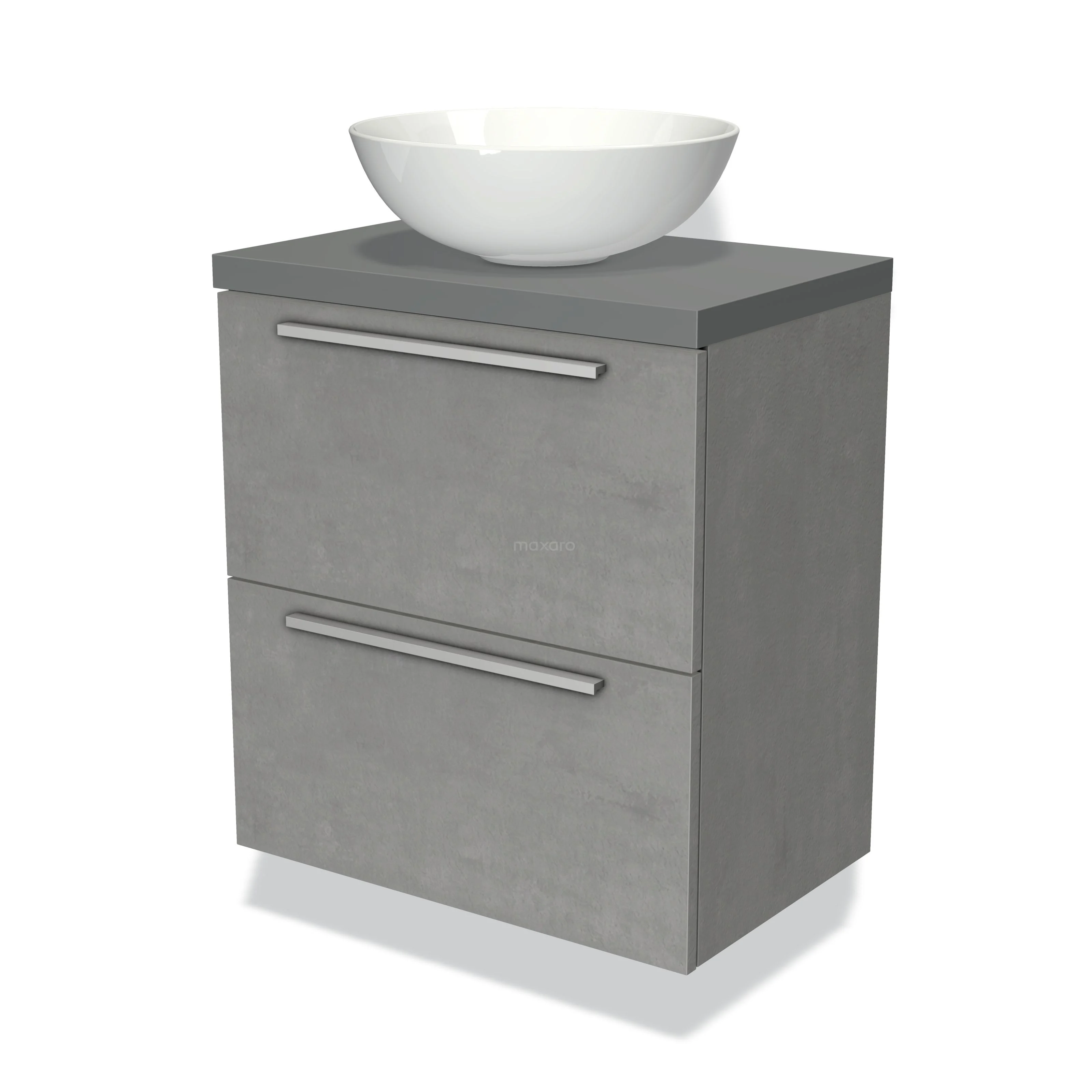 Modulo Plato Slim Badmöbel mit Aufsatzwaschbecken | 60 cm Hellgrauer Beton Flach front Mittelgrau blatt 2 übereinanderliegende Schubladen