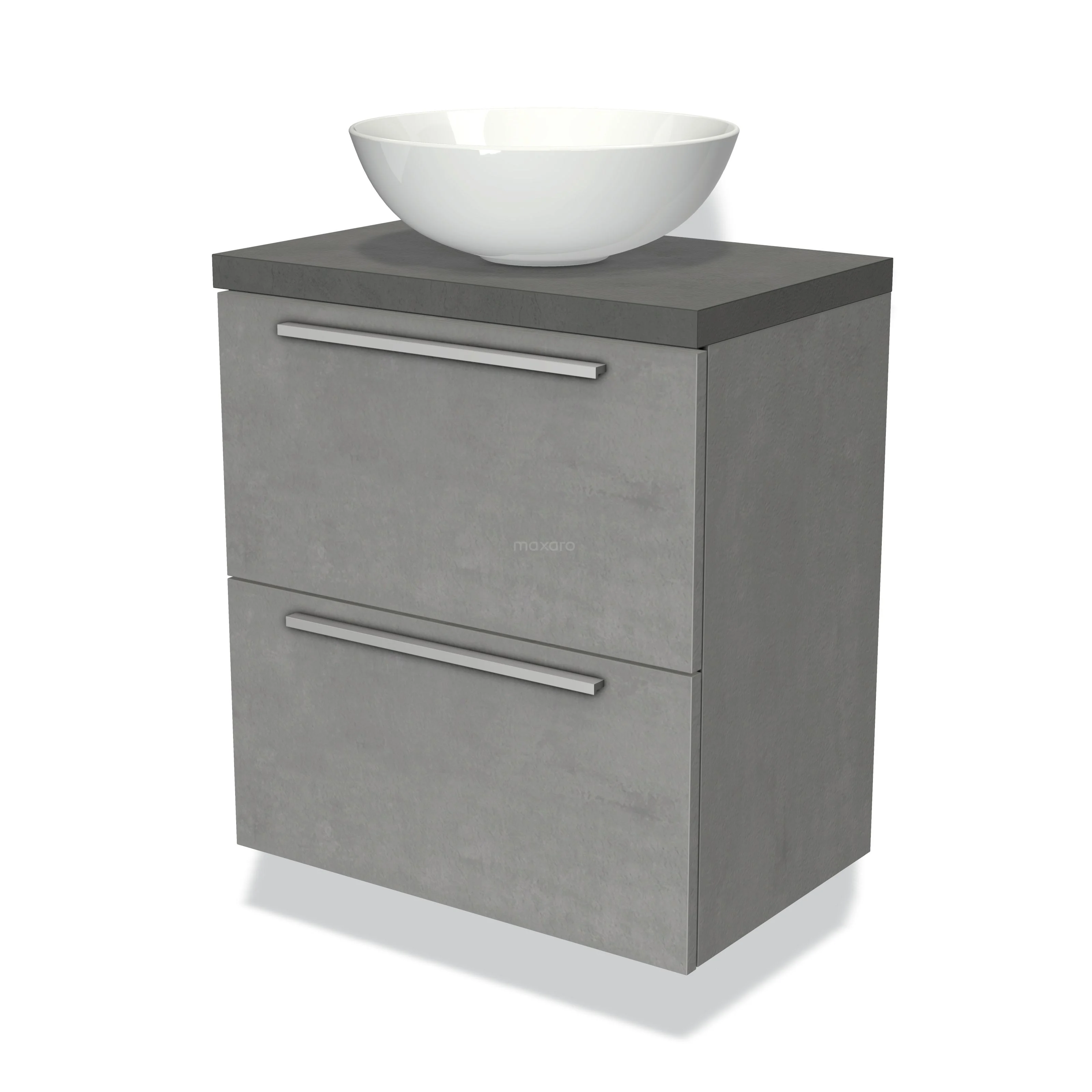 Modulo Plato Slim Badmöbel mit Aufsatzwaschbecken | 60 cm Hellgrauer Beton Flach front Dunkelgrauer Beton blatt 2 übereinanderliegende Schubladen