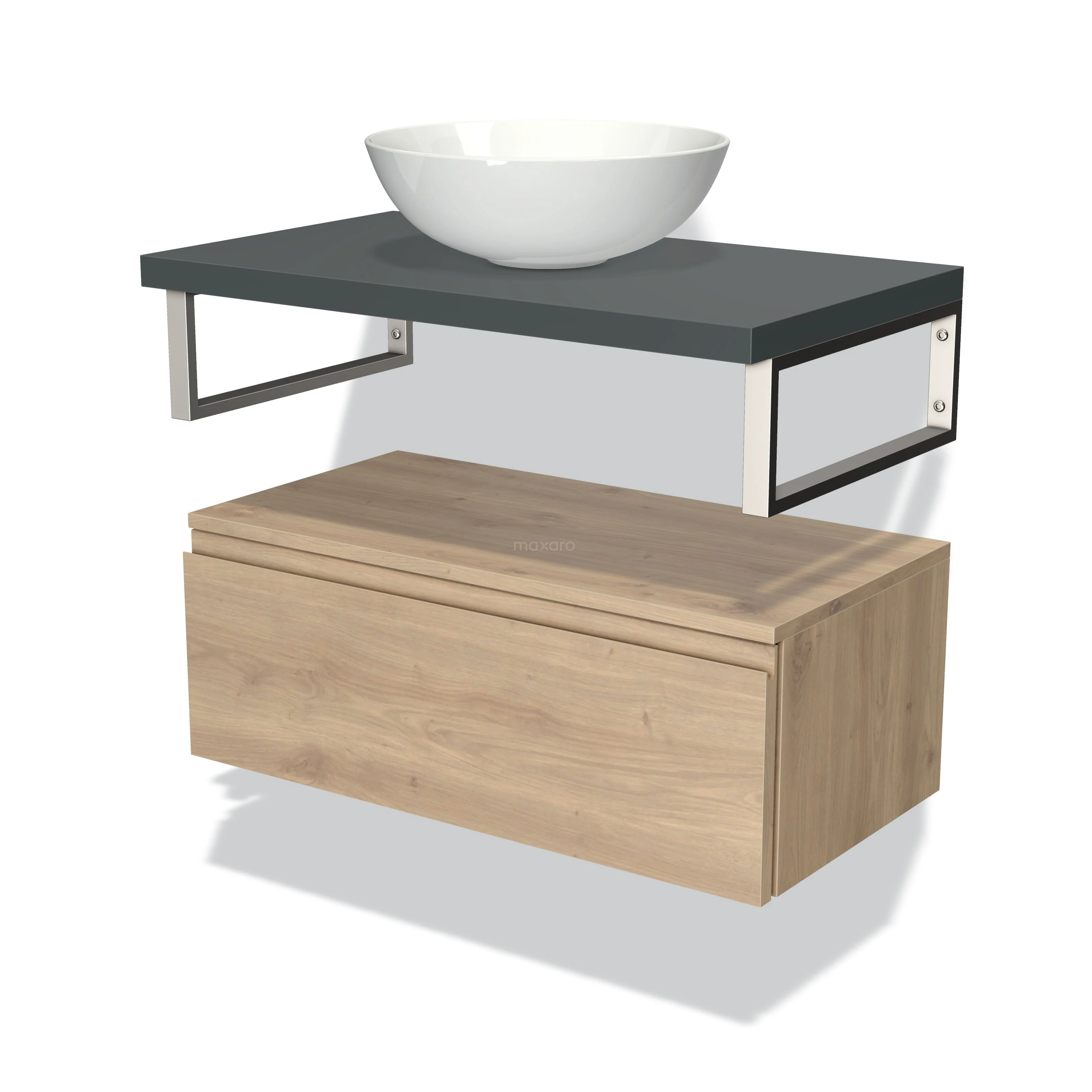 Modulo Plato Badmöbel mit Aufsatzwaschbecken | 80 cm Hellbraune Eiche Grifflos front Dunkelgrau blatt Tief hängend