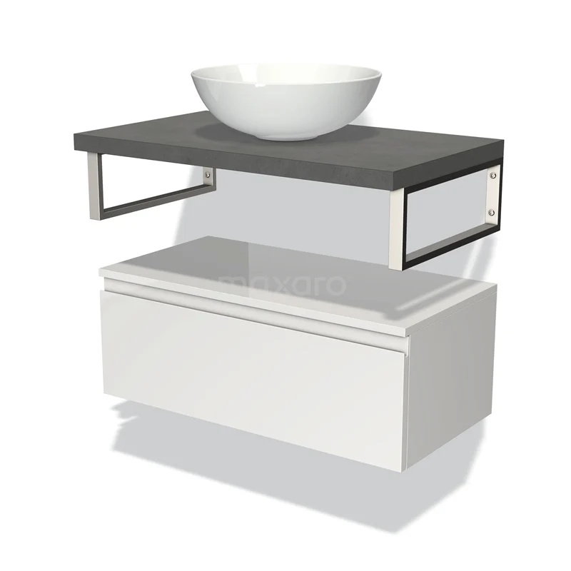 Badmöbel für Aufsatzwaschbecken 80 cm Modulo Plato Hochglanz Weiß 1 Schublade Grifflos Dunkelgrau Beton Platte