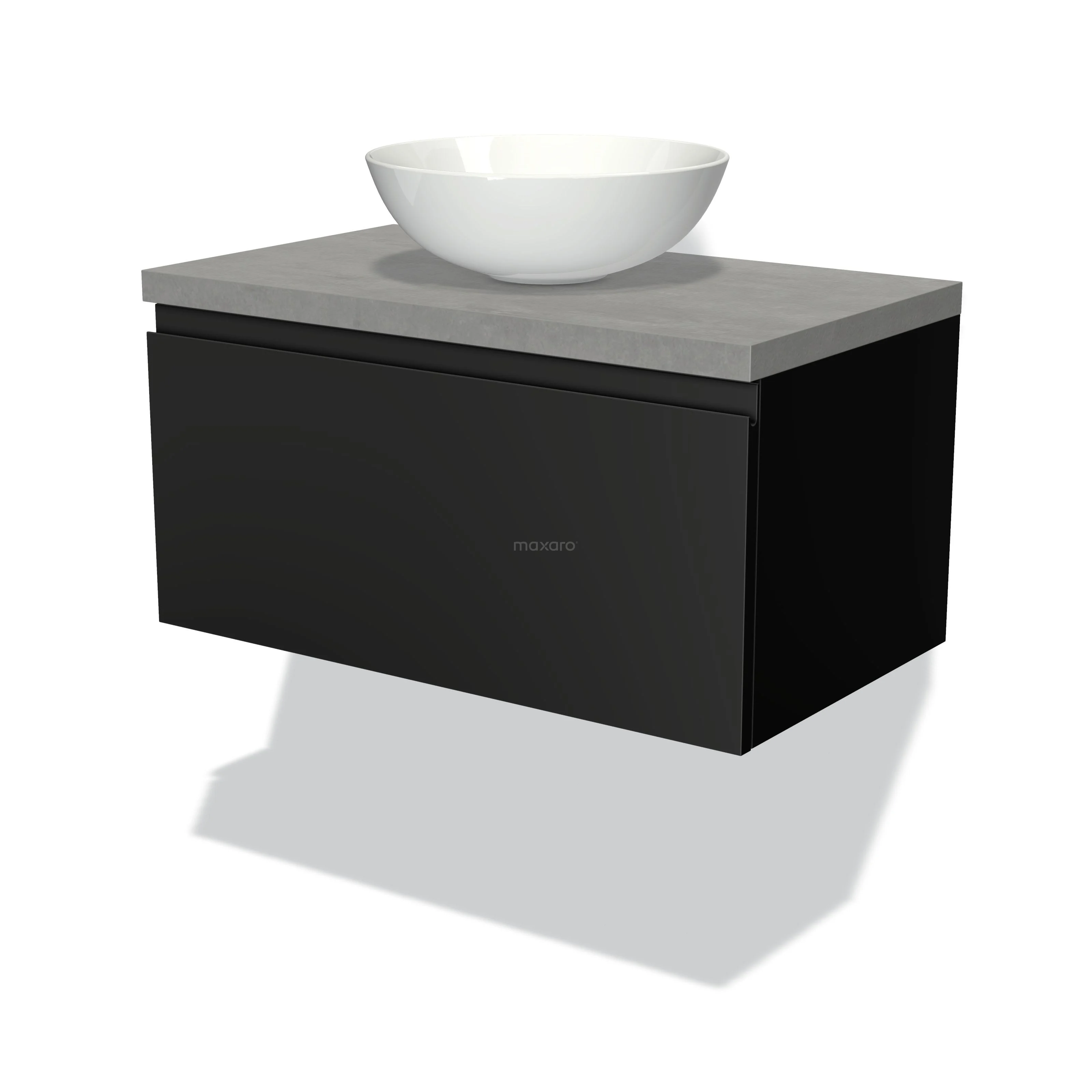 Badmöbel für Aufsatzwaschbecken 80cm Modulo Plato Matt Schwarz 1 Schublade grifflos hellgrauer Beton Platte
