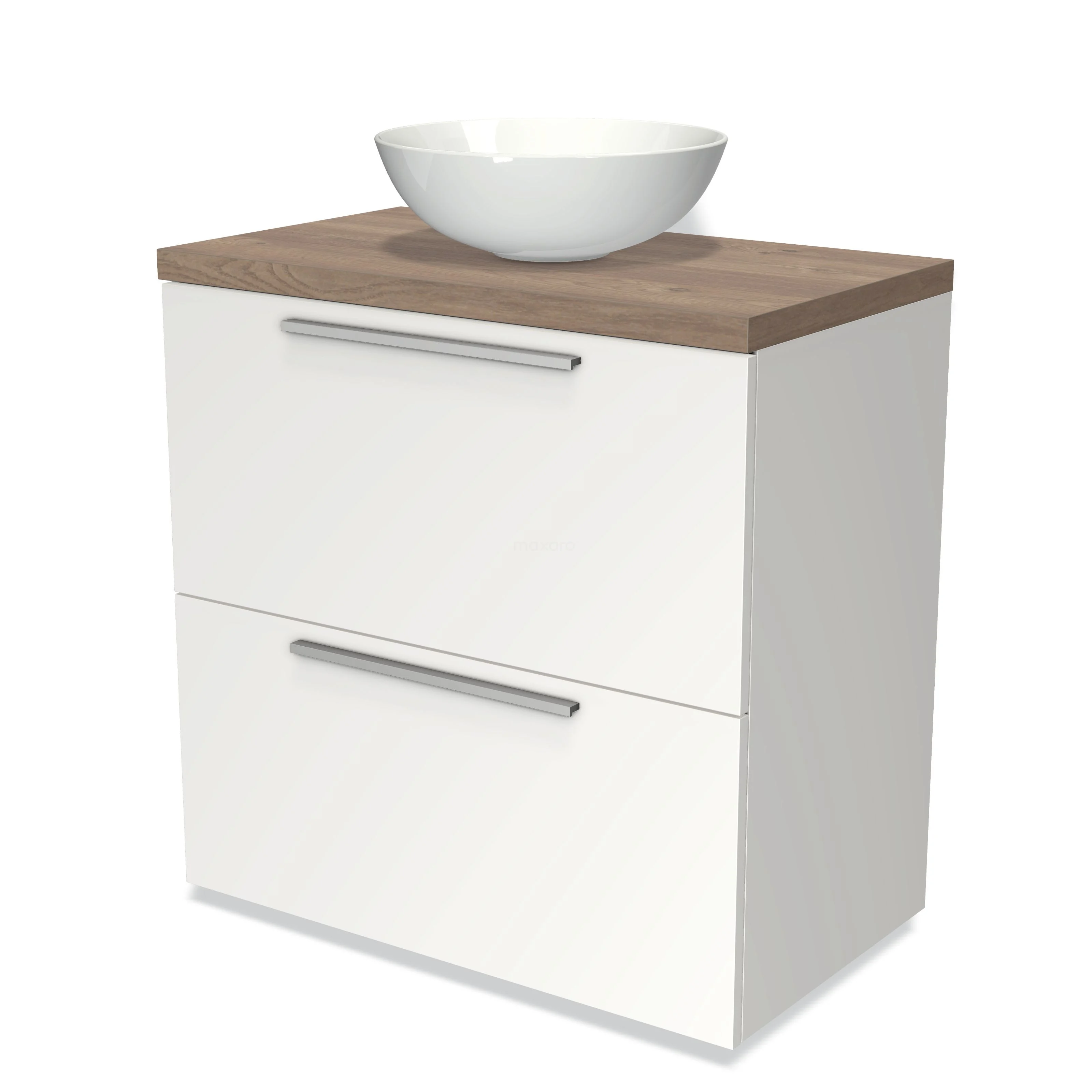 Badmöbel für Aufsatzwaschbecken 80cm Modulo Plato Matt Weiß 2 hohe Schubladen Flach Mittelbraune Eiche Platte