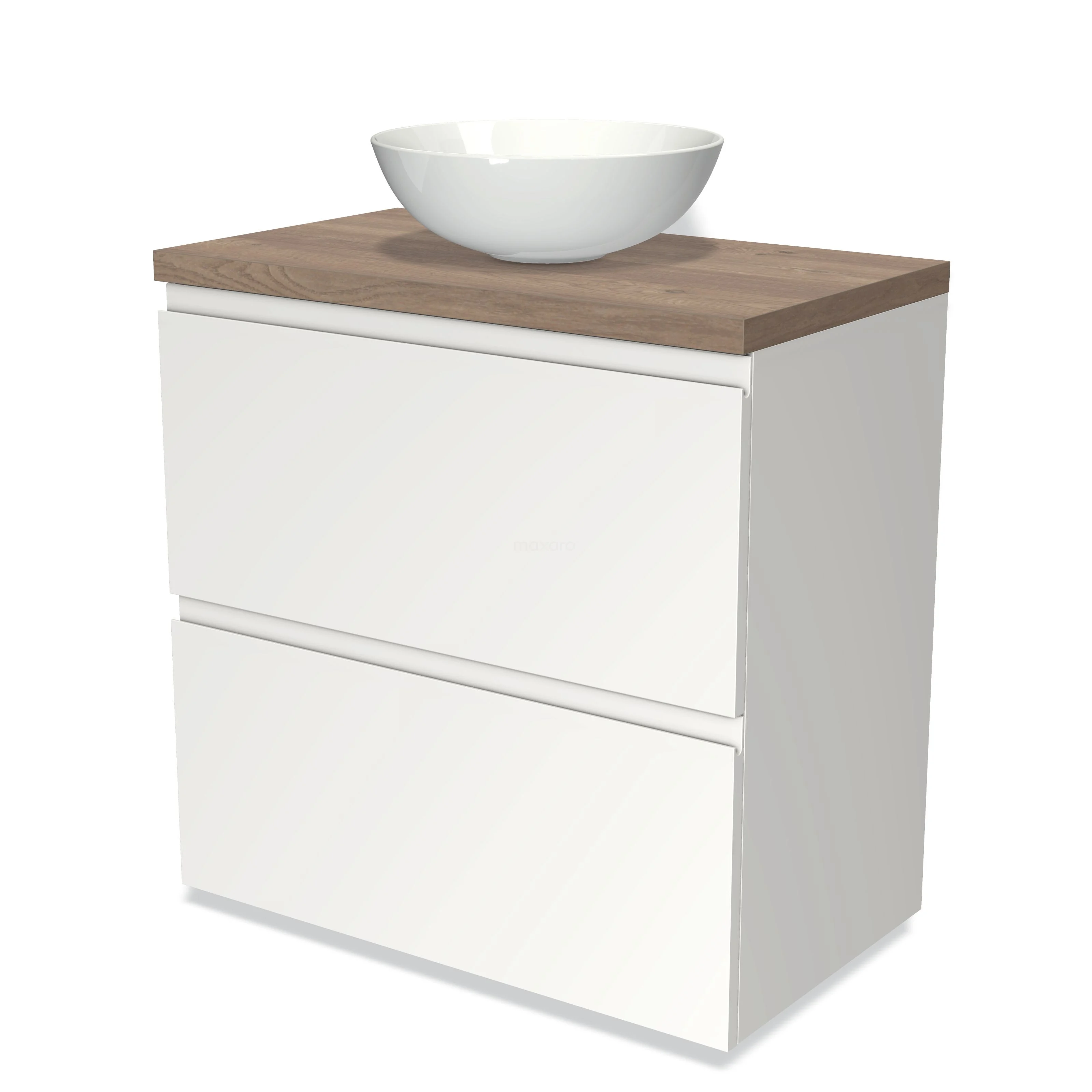 Badmöbel für Aufsatzwaschbecken 80cm Modulo Plato Matt Weiß 2 hohe Schubladen Grifflos mittelbraune Eiche Platte