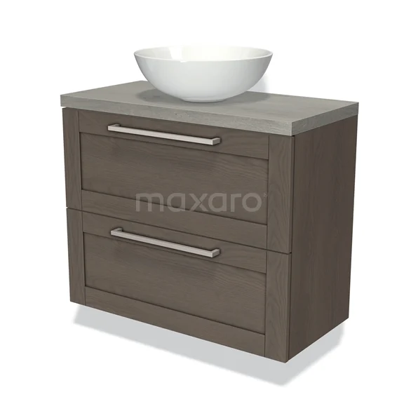 Modulo Plato Slim Badmöbel mit Aufsatzwaschbecken | 80 cm Dunkelbraune Eiche Rahmen front Graue Eiche blatt 2 übereinanderliegende Schubladen
