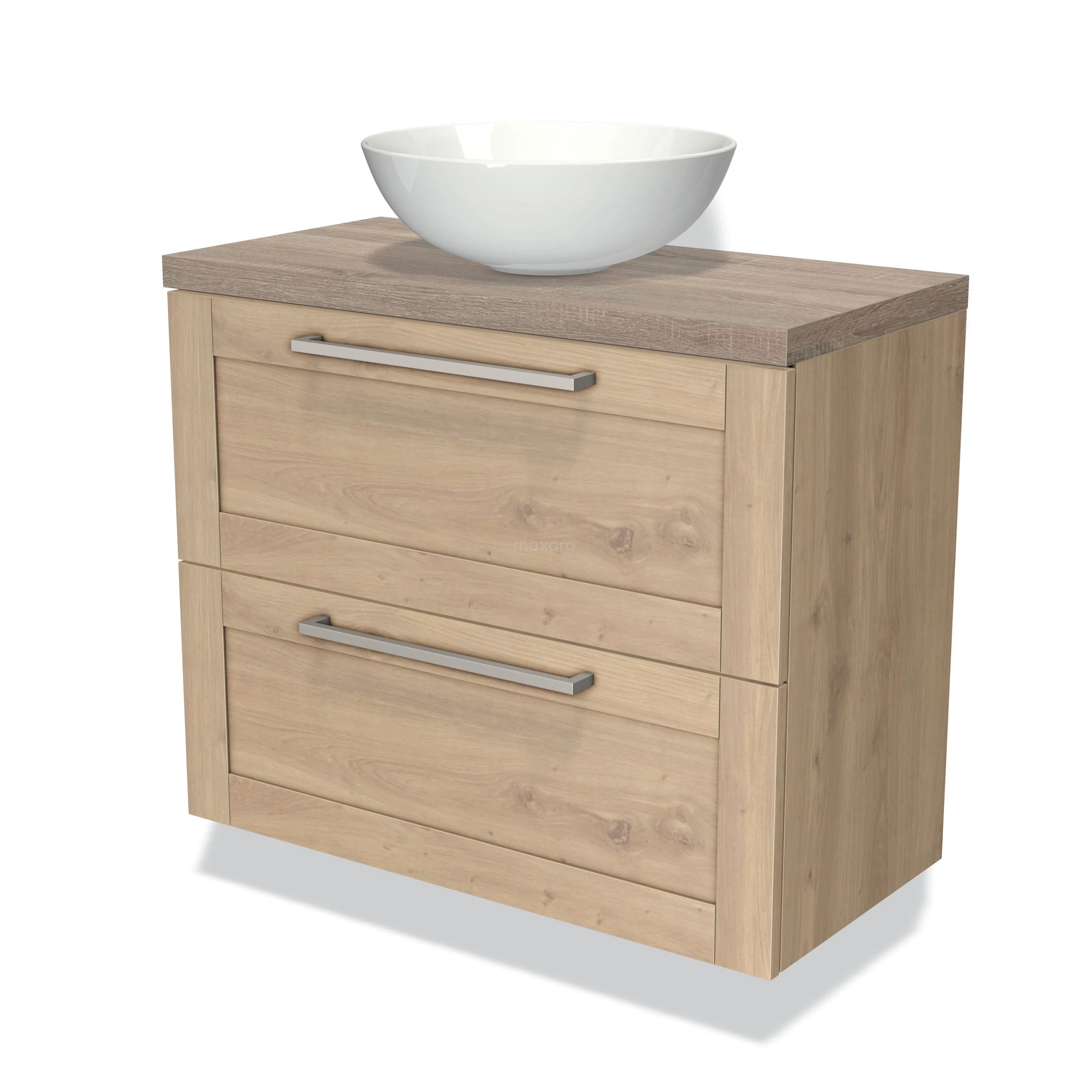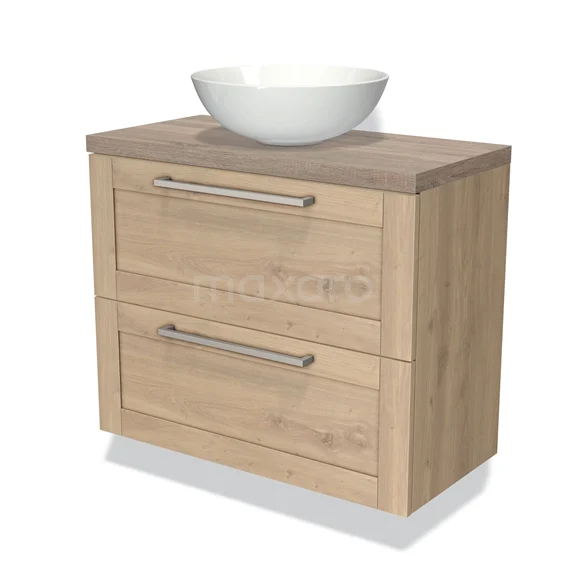 Modulo Plato Slim Badmöbel mit Aufsatzwaschbecken | 80 cm Hellbraune Eiche Rahmen front Eiche blatt 2 übereinanderliegende Schubladen