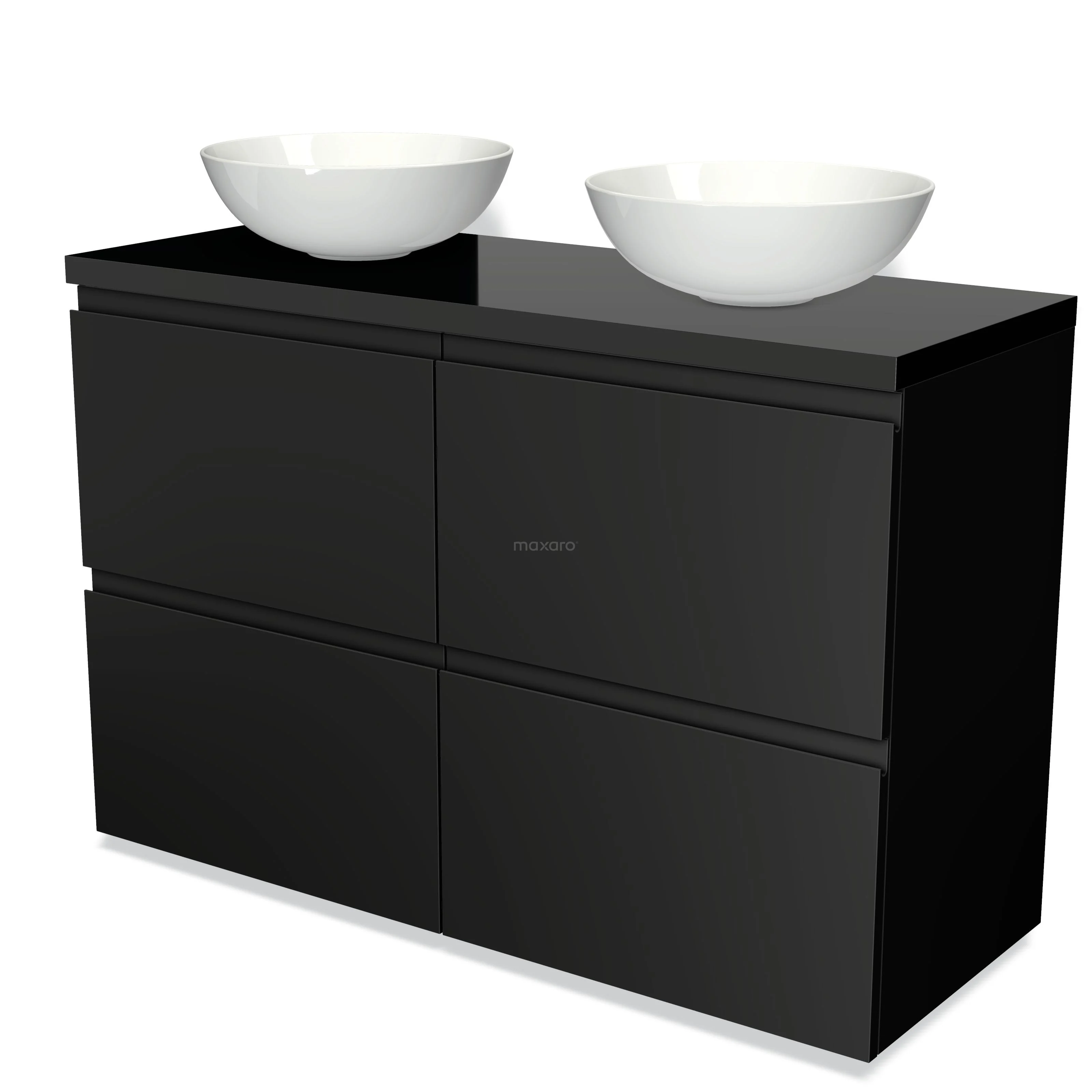 Modulo Plato Badmöbel mit Aufsatzwaschbecken | 120 cm Matt Schwarz Grifflos front Hochglanz Schwarz blatt 4 hohe Schubladen