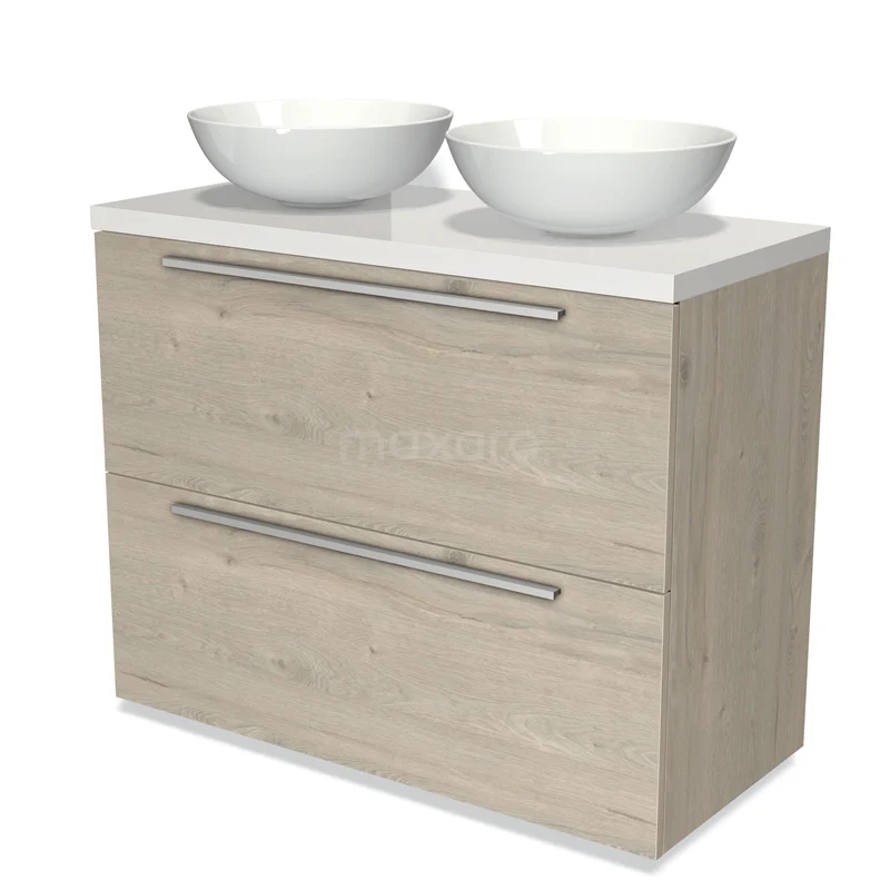 Badmöbel für Waschtischunterschrank mit Konsole 100cm Modulo Plato Hellgraue Eiche 2 hohe Schubladen Flach Hochglanz Weiß Platte