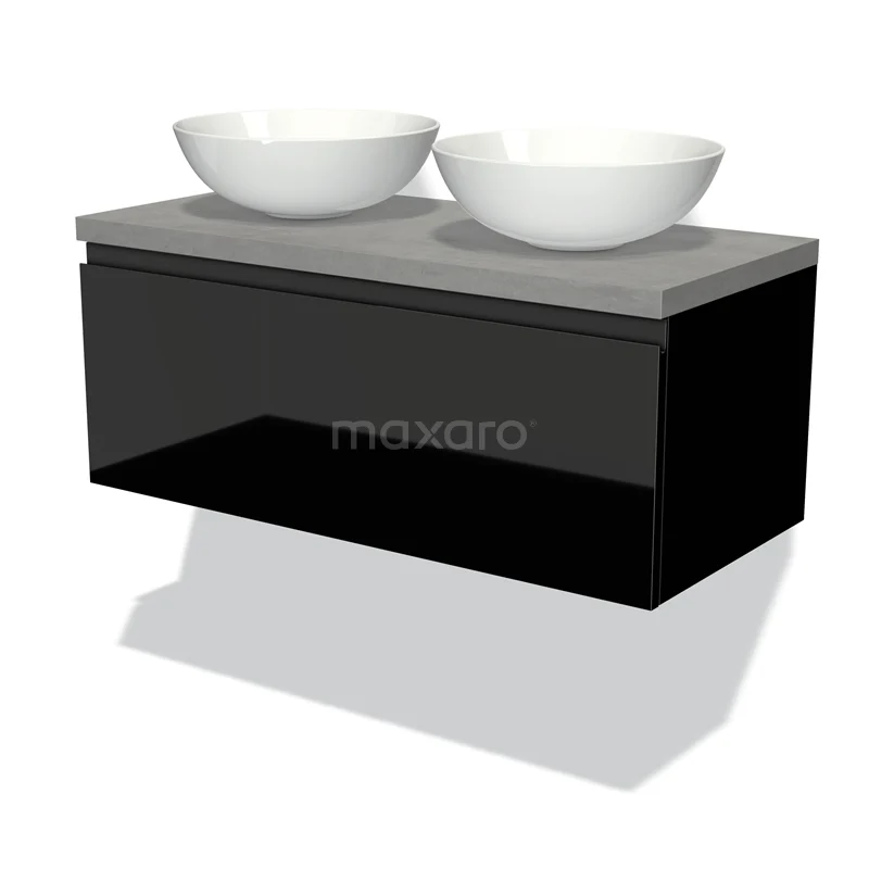 Badmöbel für Waschtischunterschrank mit Konsole 100cm Modulo Plato Hochglanz Schwarz 1 Schublade Grifflos hellgrauer Beton Platte