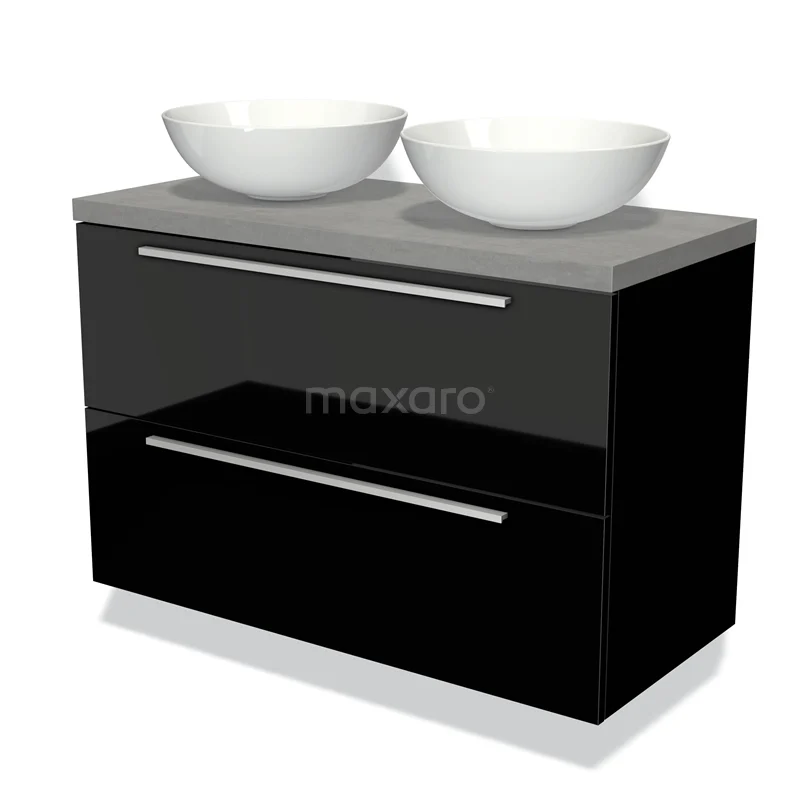 Badmöbel für Waschtischunterschrank mit Konsole 100cm Modulo Plato Hochglanz Schwarz 2 Schubladen Flach Hellgrauer Beton Platte
