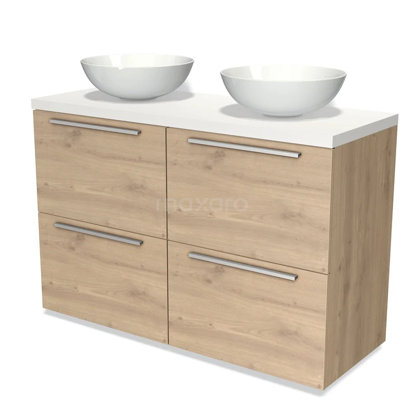Modulo Plato Badmöbel mit Aufsatzwaschbecken | 120 cm Hellbraune Eiche Flach front Matt Weiß blatt 4 hohe Schubladen