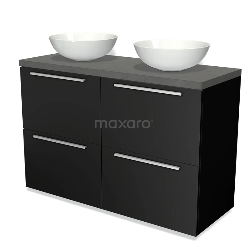 Modulo Plato Badmöbel mit Aufsatzwaschbecken | 120 cm Matt Schwarz Flach front Dunkelgrauer Beton blatt 4 hohe Schubladen