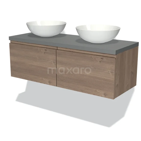 Modulo Plato Badmöbel mit Aufsatzwaschbecken | 120 cm Mittelbraune Eiche Grifflos front Mittelgrau blatt 2 nebeneinanderliegende Schubladen