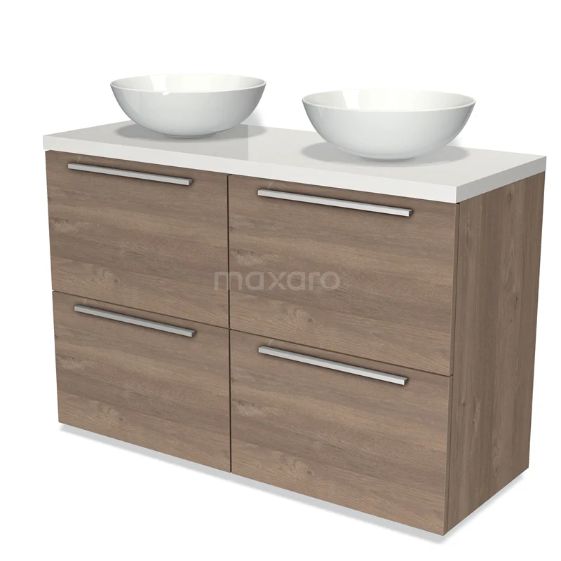 Modulo Plato Badmöbel mit Aufsatzwaschbecken | 120 cm Mittelbraune Eiche Flach front Hochglanz Weiß blatt 4 hohe Schubladen