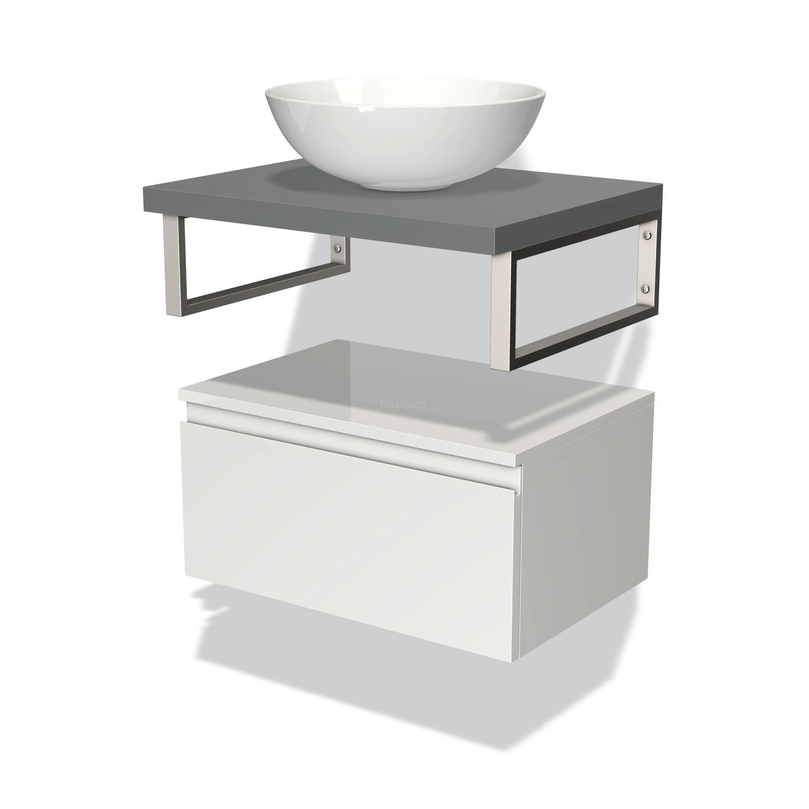 Modulo Plato Badmöbel mit Aufsatzwaschbecken | 60 cm Hochglanz Weiß Grifflos front Mittelgrau blatt Tief hängend