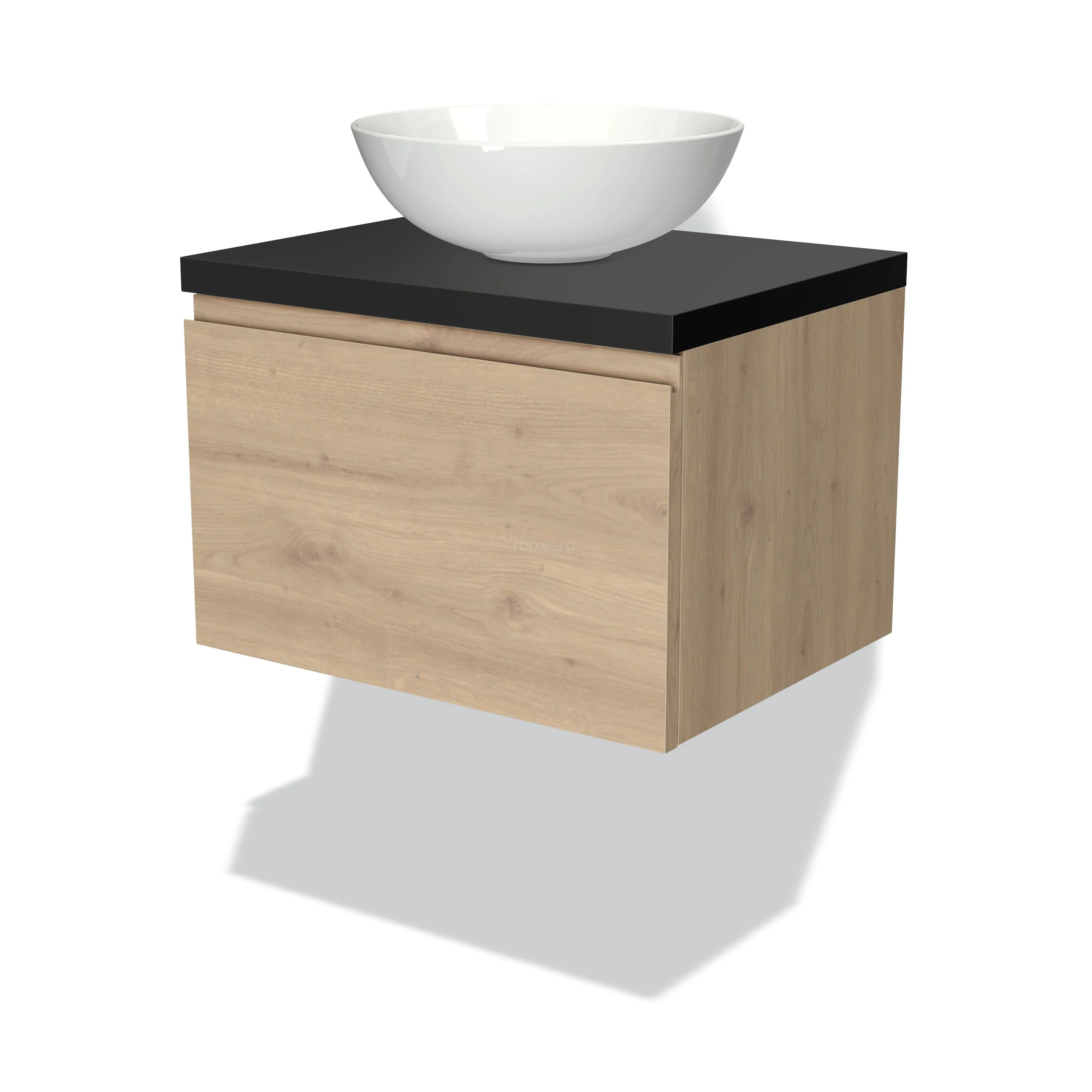 Badmöbel für Waschtischunterschrank mit Konsole 60cm Modulo Plato hellbraune Eiche 1 Schublade grifflos Matt Schwarz Platte