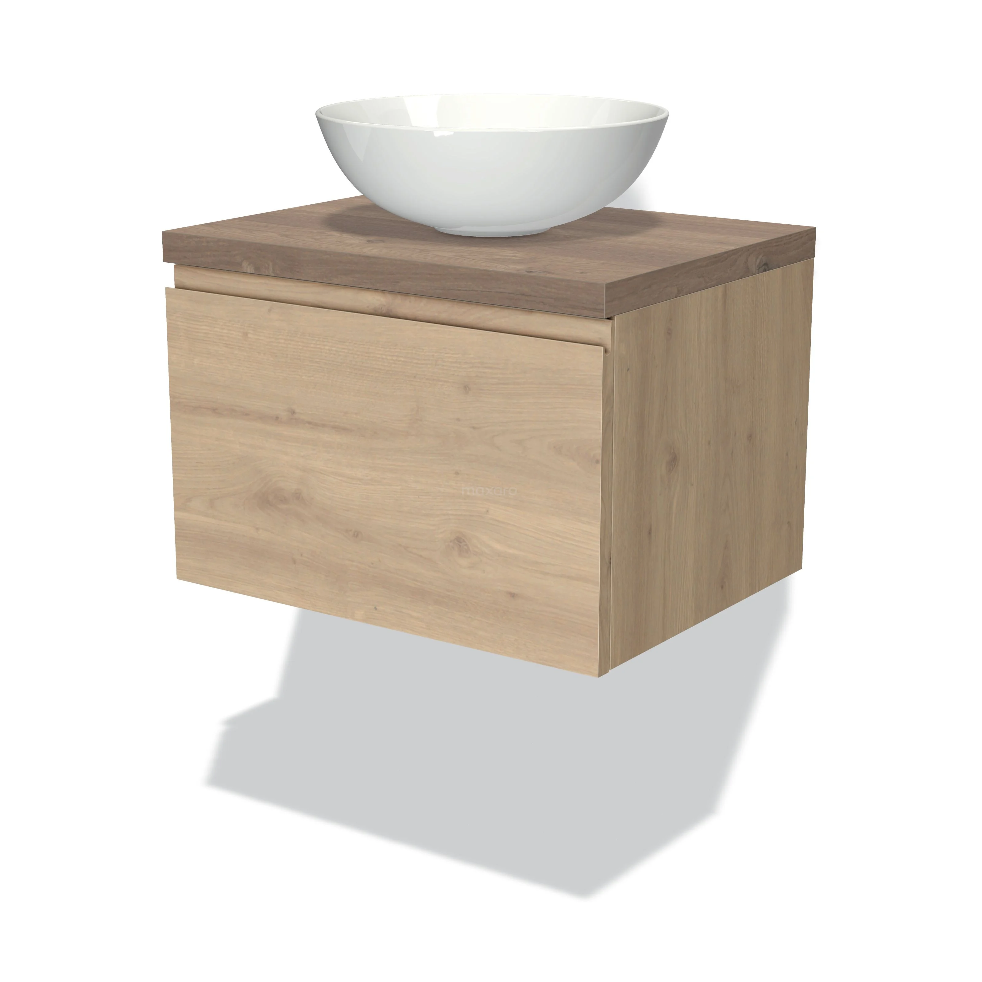 Badmöbel für Waschtischunterschrank mit Konsole 60cm Modulo Plato hellbraune Eiche 1 Schublade grifflos mittelbraune Eiche Platte