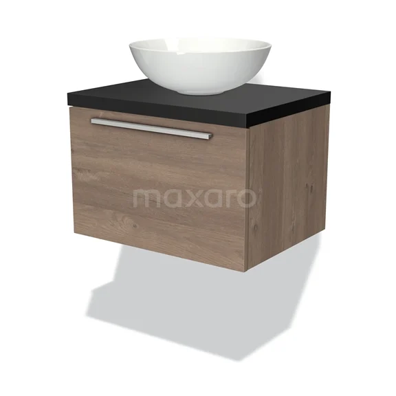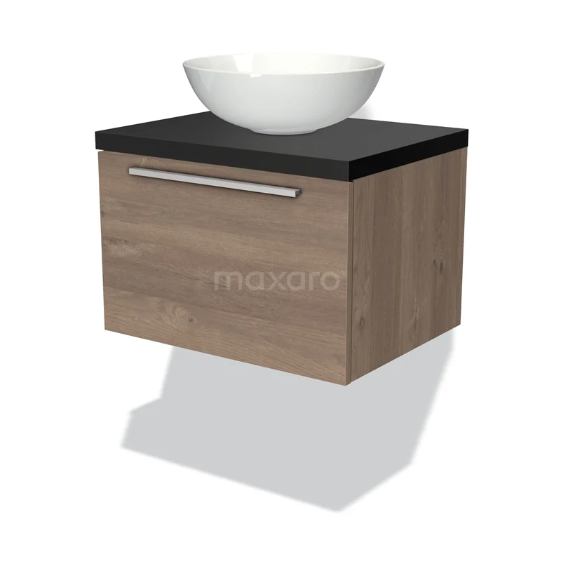 Badmöbel für Waschtischunterschrank mit Konsole 60cm Modulo Plato mittelbraune Eiche 1 Schublade flach Matt Schwarz Platte