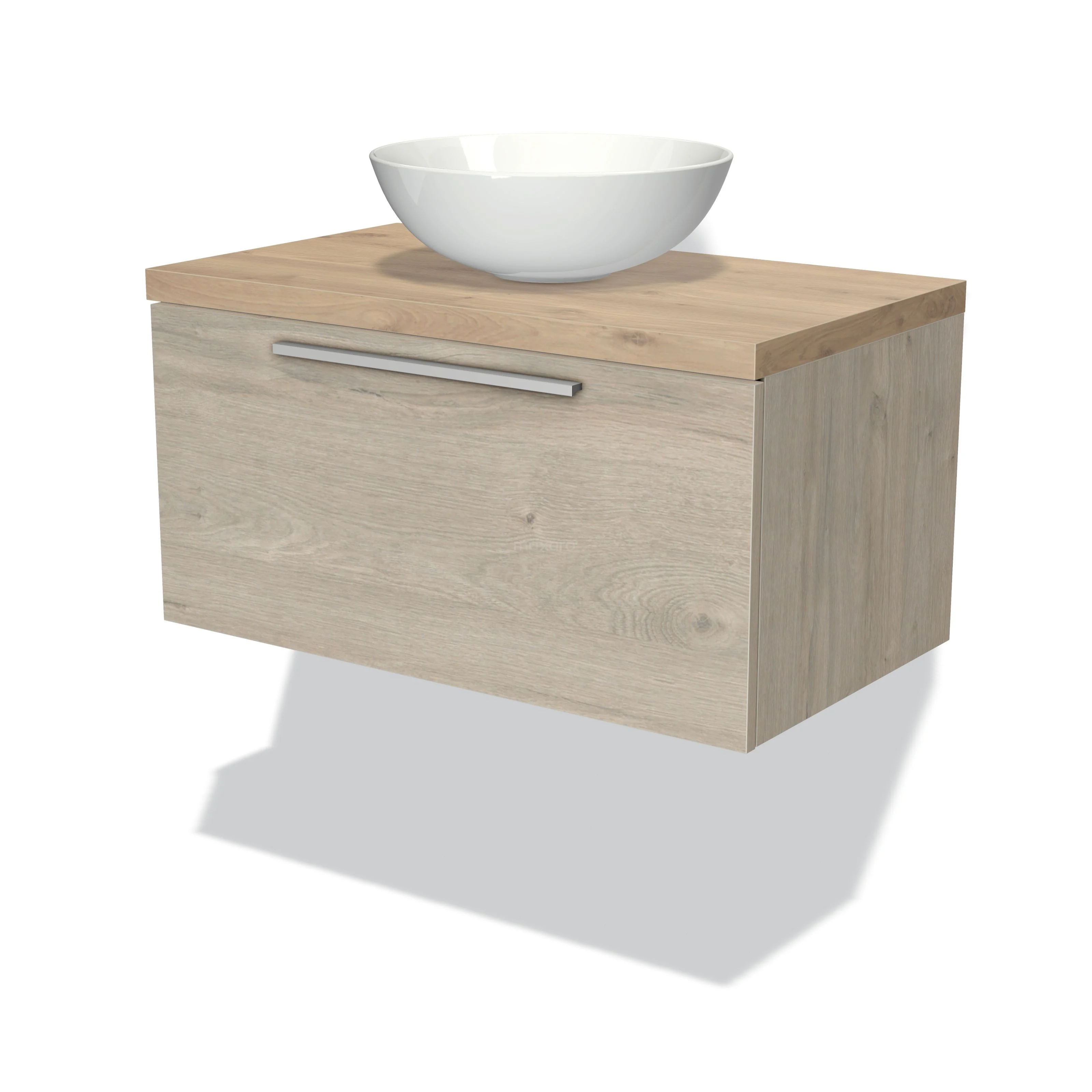 Badmöbel für Waschtischunterschrank mit Konsole 80cm Modulo Plato hellgraue Eiche 1 Schublade flach hellbraune Eiche Platte