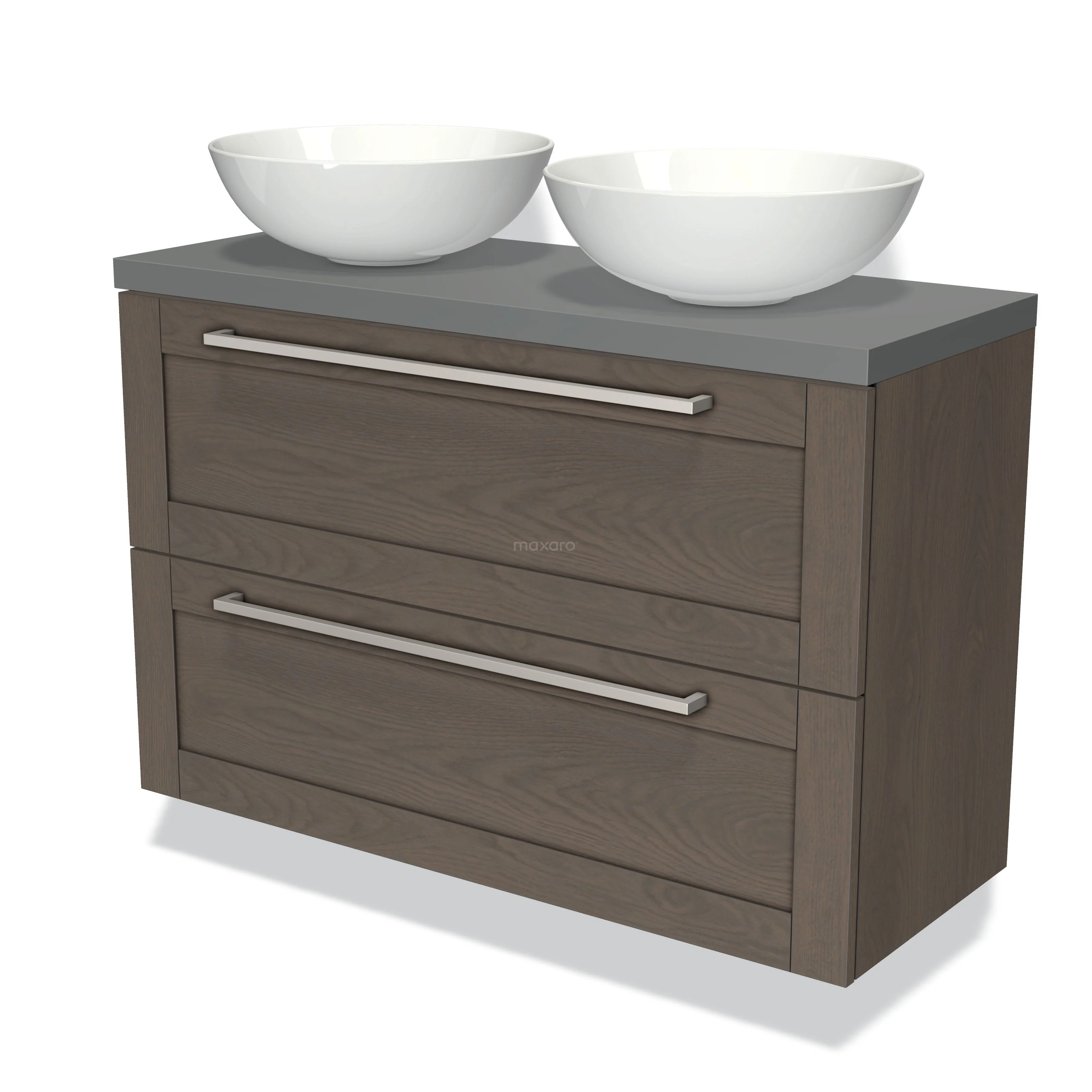 Modulo Plato Slim Badmöbel mit Aufsatzwaschbecken | 100 cm Dunkelbraune Eiche Rahmen front Mittelgrau blatt 2 übereinanderliegende Schubladen