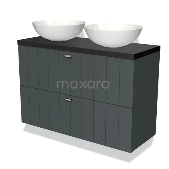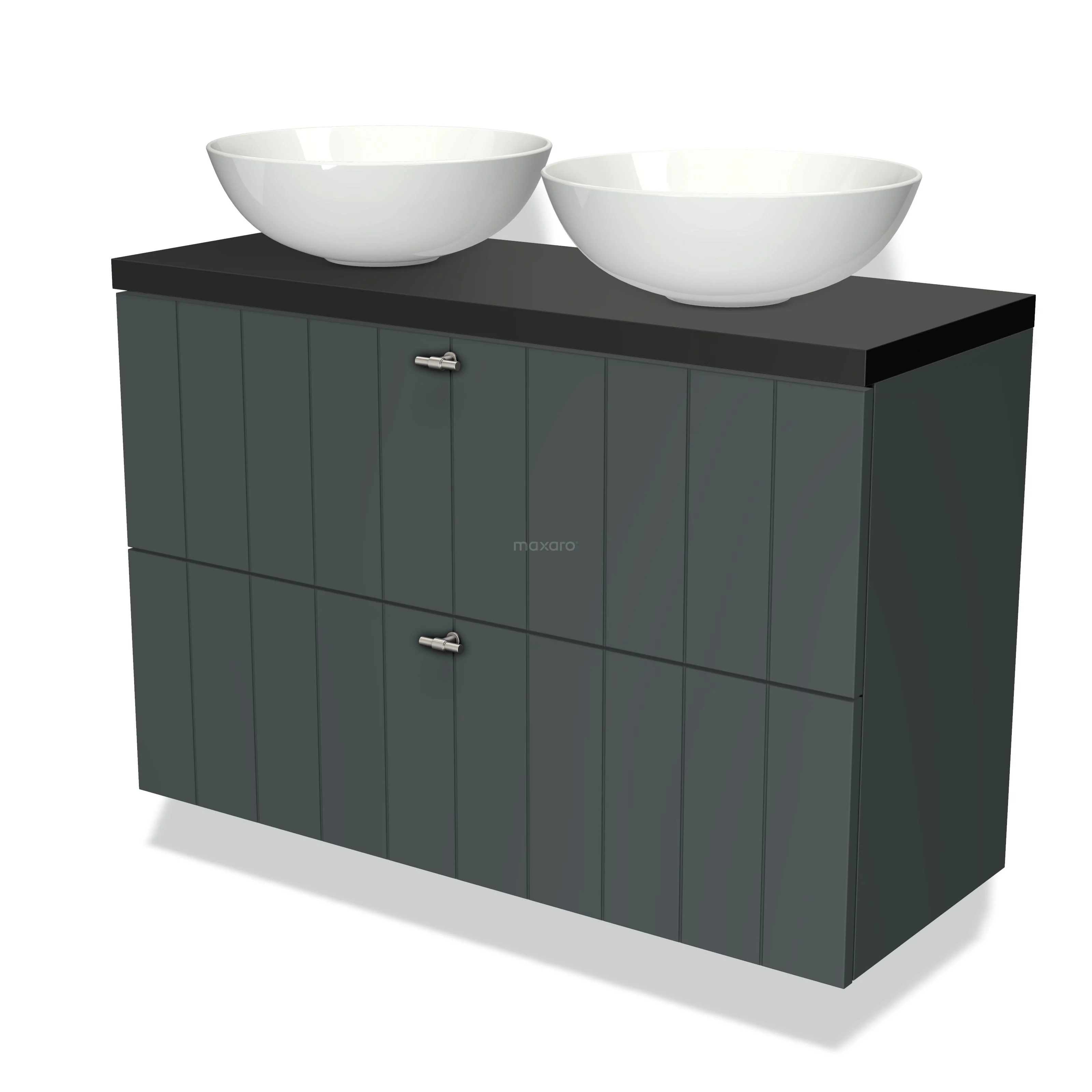 Modulo Plato Slim Badmöbel mit Aufsatzwaschbecken | 100 cm Dunkelgrau Lamelle front Matt Schwarz blatt 2 übereinanderliegende Schubladen