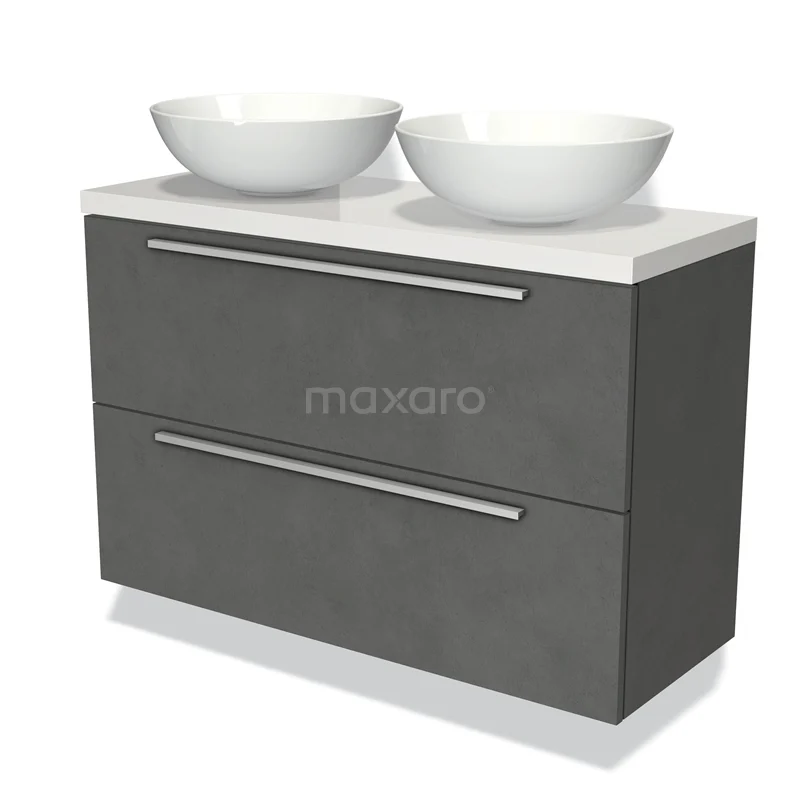 Modulo Plato Slim Badmöbel mit Aufsatzwaschbecken | 100 cm Dunkelgrauer Beton Flach front Hochglanz Weiß blatt 2 übereinanderliegende Schubladen
