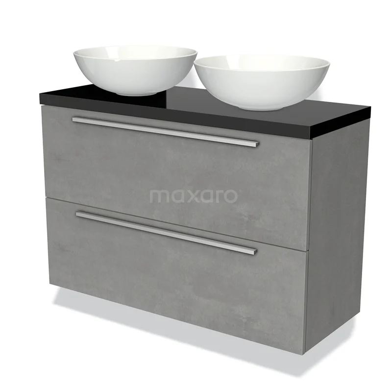 Modulo Plato Slim Badmöbel mit Aufsatzwaschbecken | 100 cm Hellgrauer Beton Flach front Hochglanz Schwarz blatt 2 übereinanderliegende Schubladen