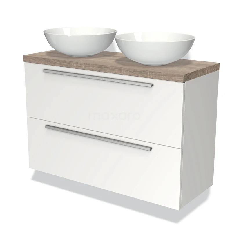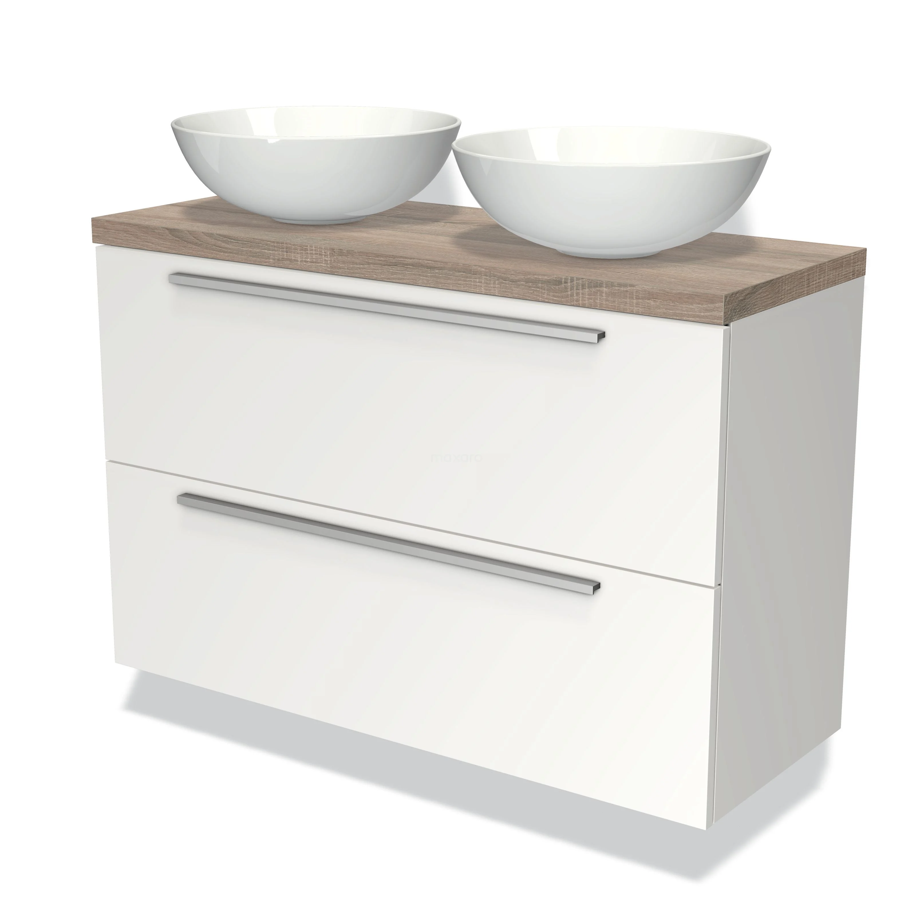 Weißes Badezimmermöbel mit zwei keramischen Aufsatzwaschbecken, Holzplatte und metallischen Haltegriffen; modernes Design für jedes Badezimmer.