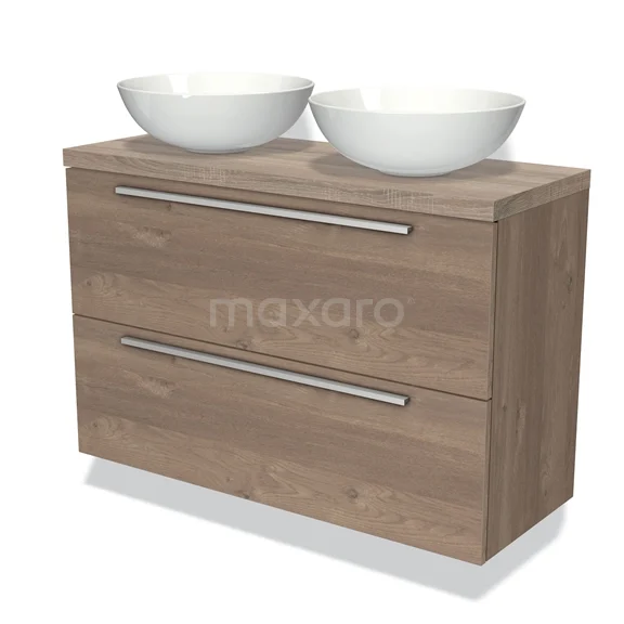 Modulo Plato Slim Badmöbel mit Aufsatzwaschbecken | 100 cm Mittelbraune Eiche Flach front Eiche blatt 2 übereinanderliegende Schubladen