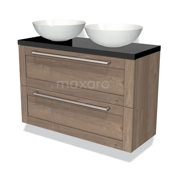 Modulo Plato Slim Badmöbel mit Aufsatzwaschbecken | 100 cm Mittelbraune Eiche Rahmen front Hochglanz Schwarz blatt 2 übereinanderliegende Schubladen