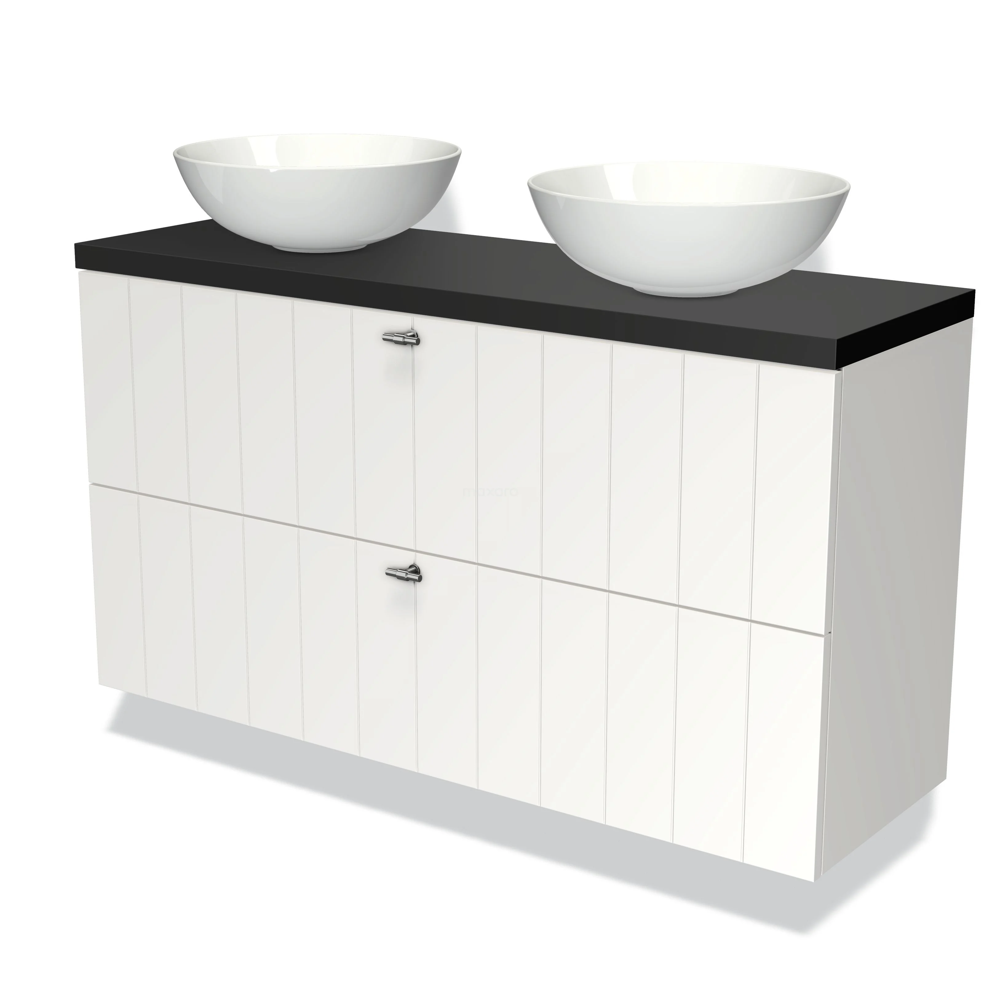 Modulo Plato Slim Badmöbel mit Aufsatzwaschbecken | 120 cm Matt Weiß Lamelle front Matt Schwarz blatt 2 übereinanderliegende Schubladen