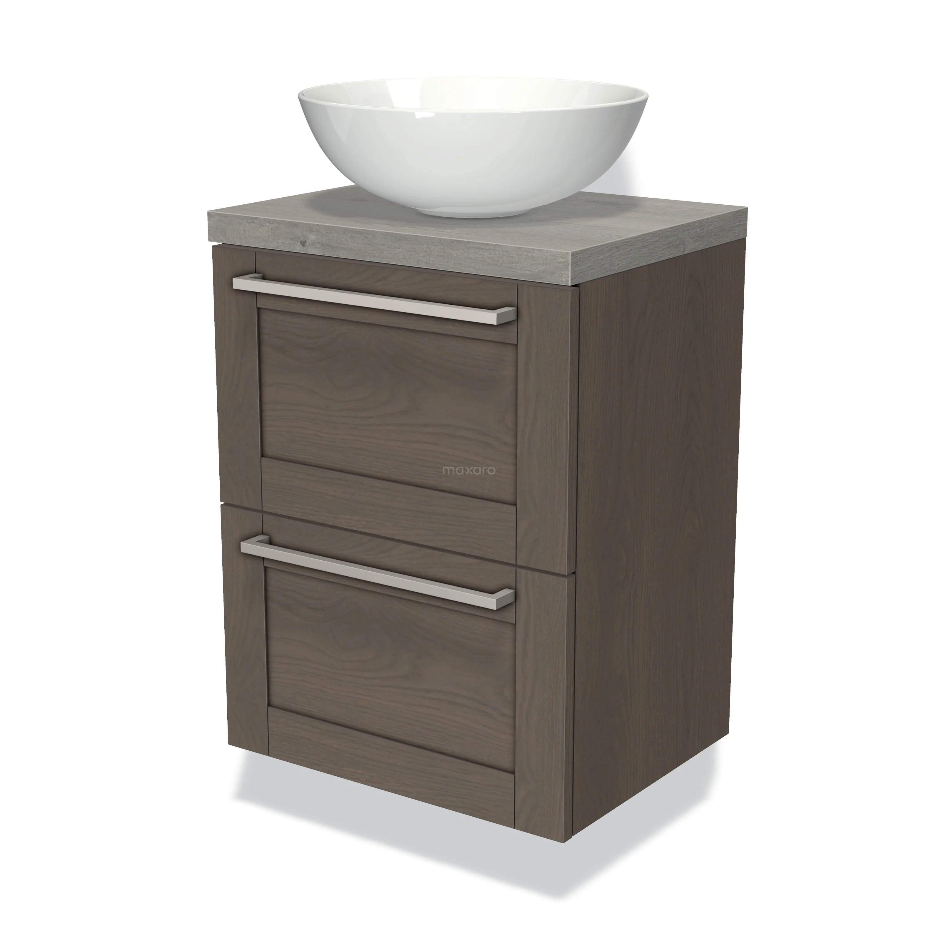 Modulo Plato Slim Badmöbel mit Aufsatzwaschbecken | 50 cm Dunkelbraune Eiche Rahmen front Graue Eiche blatt 2 übereinanderliegende Schubladen