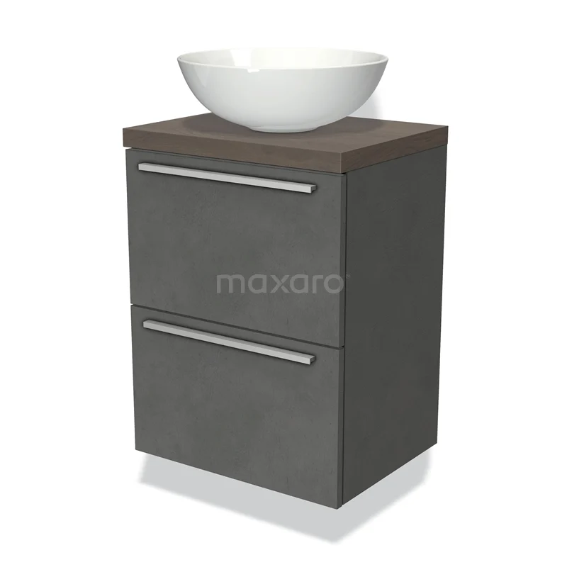 Modulo Plato Slim Badmöbel mit Aufsatzwaschbecken | 50 cm Dunkelgrauer Beton Flach front Dunkelbraune Eiche blatt 2 übereinanderliegende Schubladen