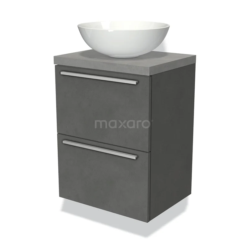 Modulo Plato Slim Badmöbel mit Aufsatzwaschbecken | 50 cm Dunkelgrauer Beton Flach front Hellgrauer Beton blatt 2 übereinanderliegende Schubladen