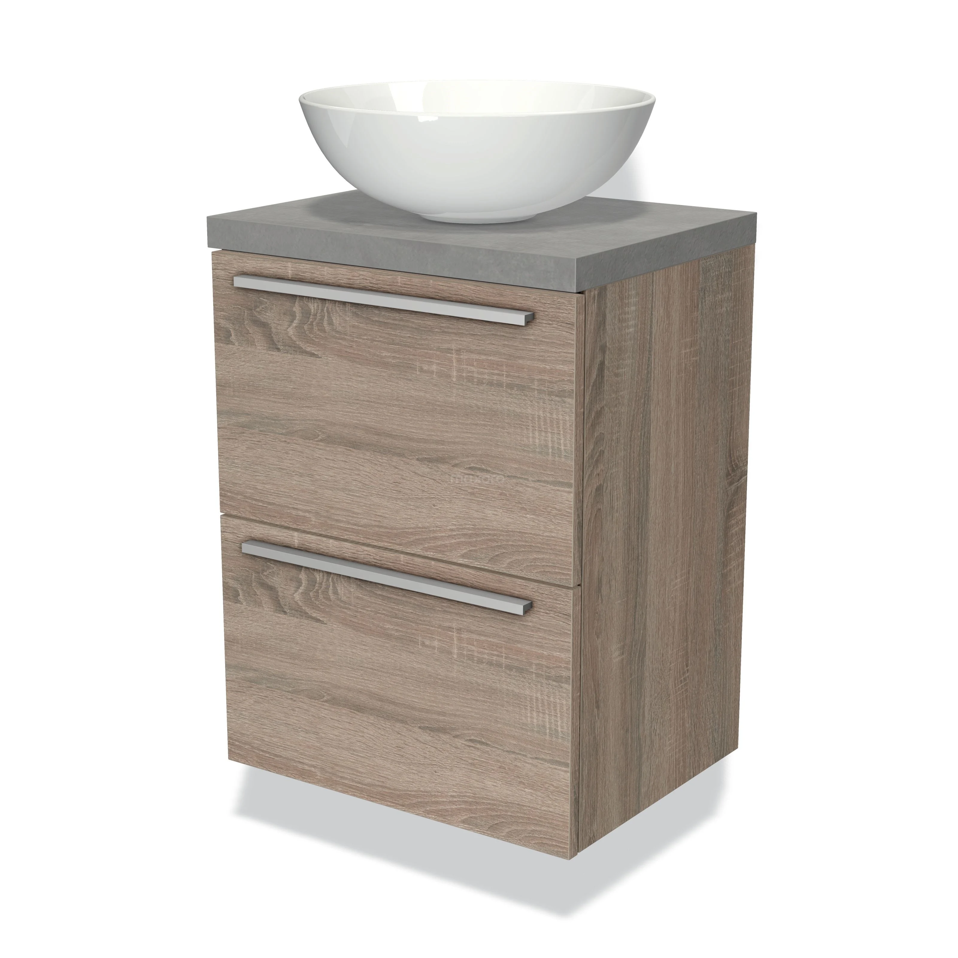 Modulo Plato Slim Badmöbel mit Aufsatzwaschbecken | 50 cm Eiche Flach front Hellgrauer Beton blatt 2 übereinanderliegende Schubladen