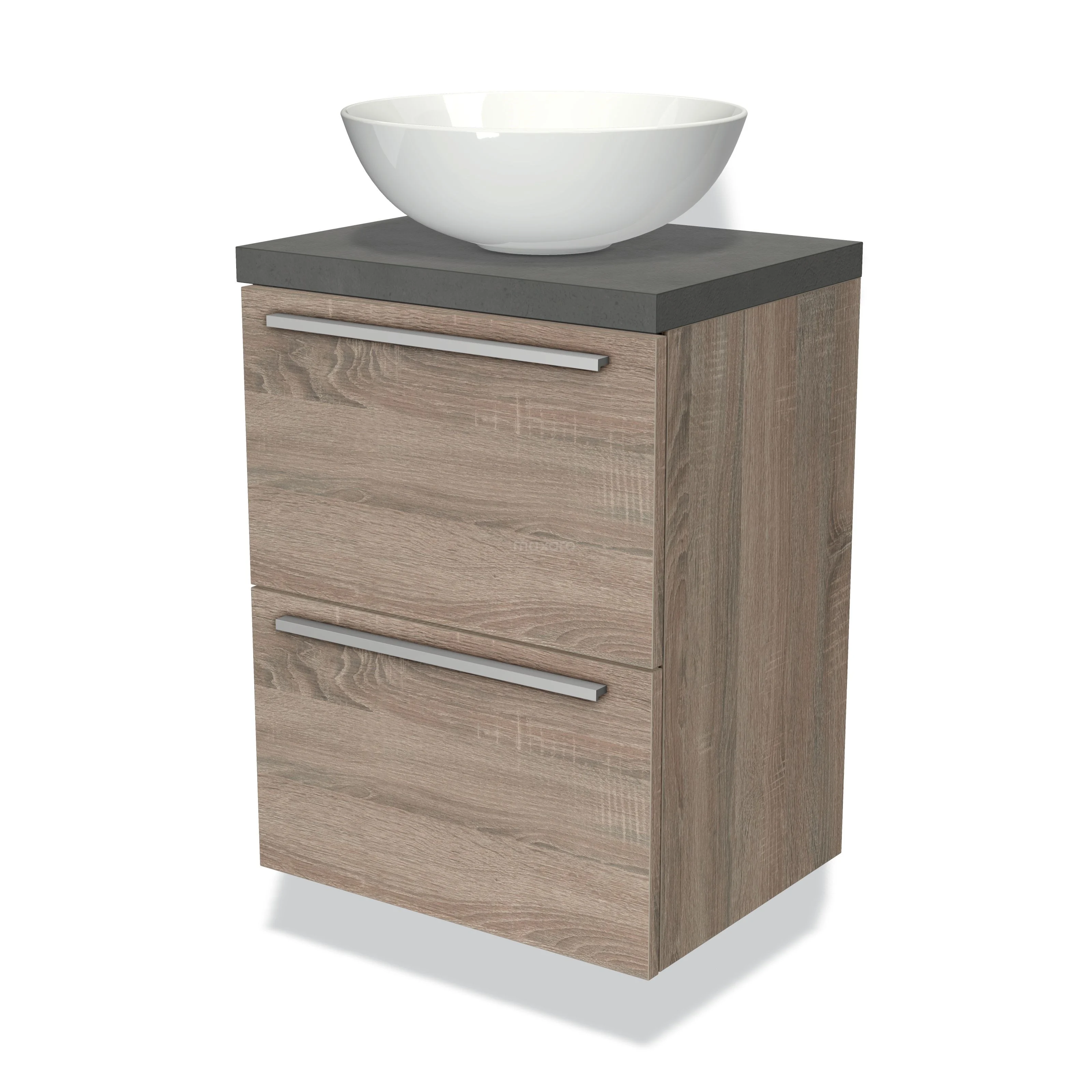 Modulo Plato Slim Badmöbel mit Aufsatzwaschbecken | 50 cm Eiche Flach front Dunkelgrauer Beton blatt 2 übereinanderliegende Schubladen