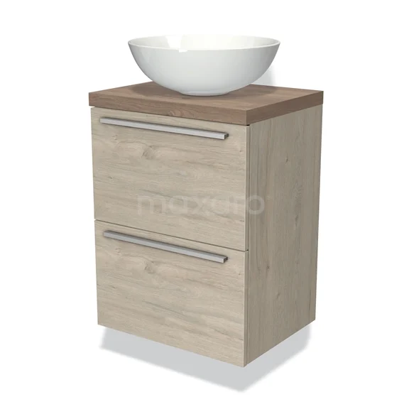 Modulo Plato Slim Badmöbel mit Aufsatzwaschbecken | 50 cm Hellgraue Eiche Flach front Mittelbraune Eiche blatt 2 übereinanderliegende Schubladen