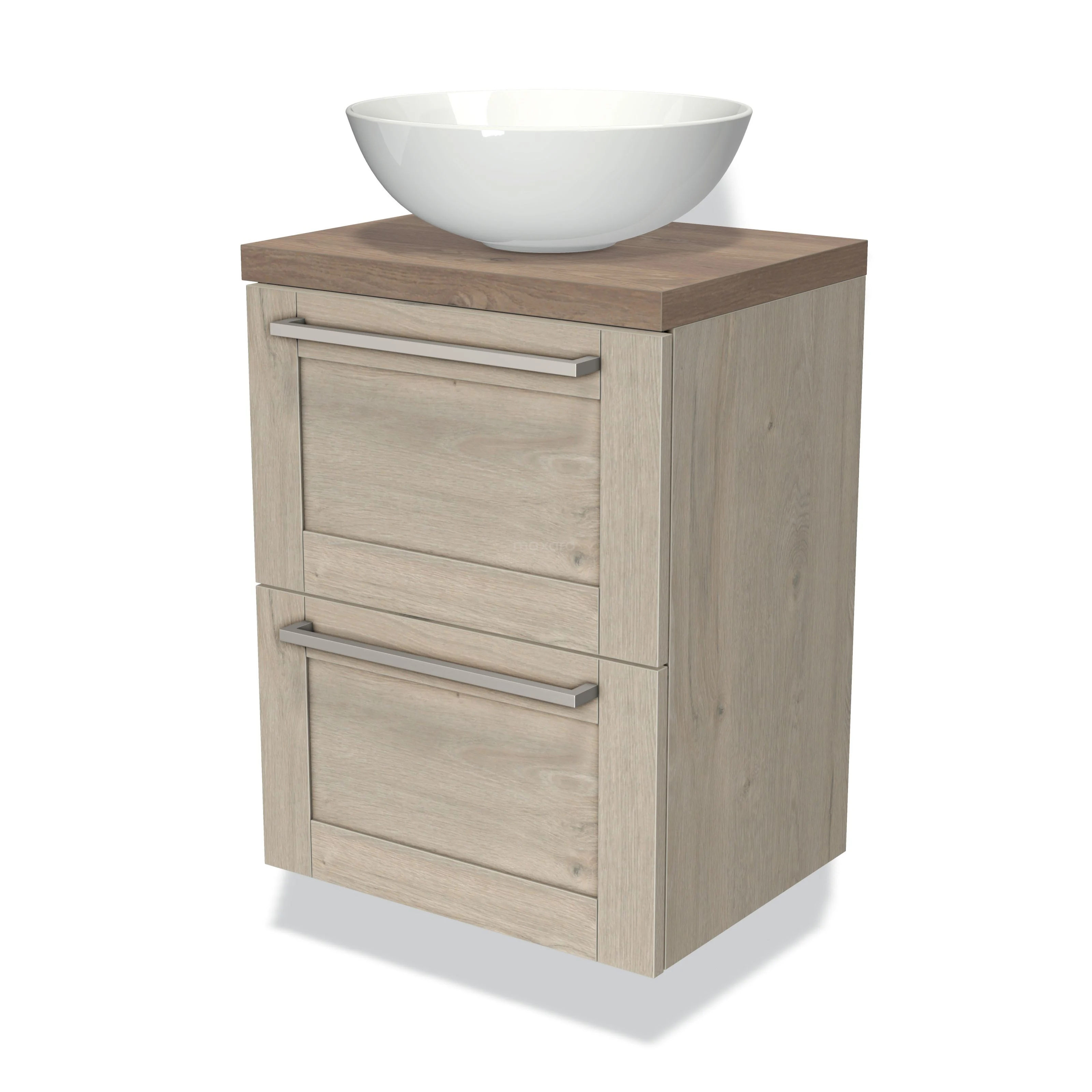 Modulo Plato Slim Badmöbel mit Aufsatzwaschbecken | 50 cm Hellgraue Eiche Rahmen front Mittelbraune Eiche blatt 2 übereinanderliegende Schubladen