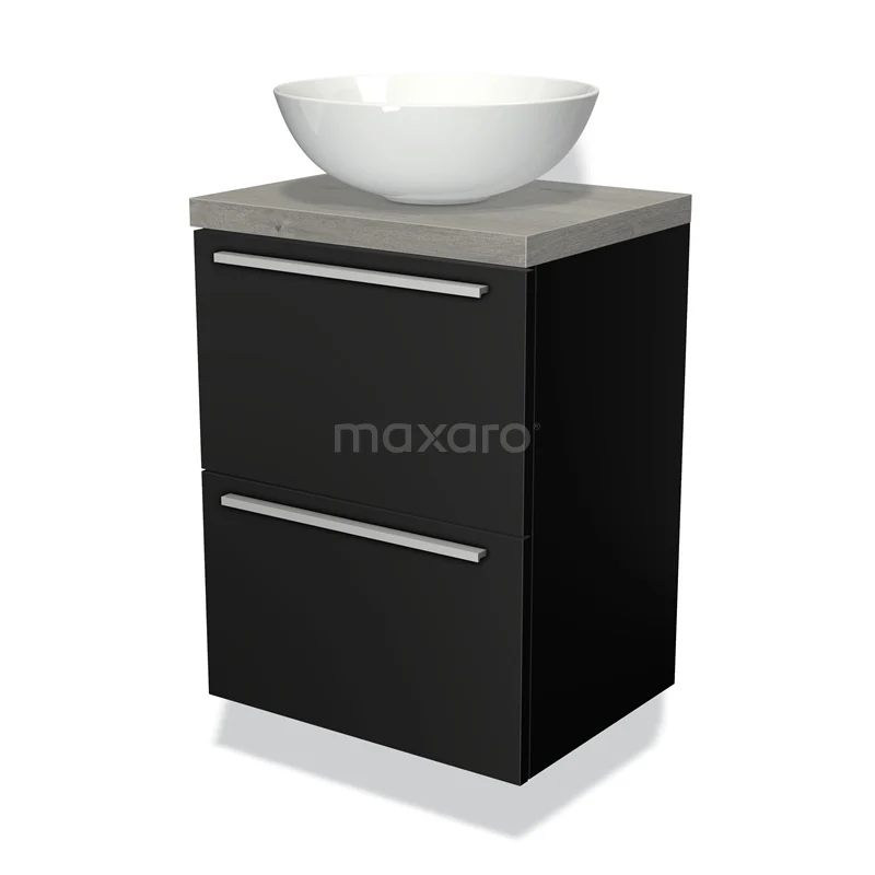 Modulo Plato Slim Badmöbel mit Aufsatzwaschbecken | 50 cm Matt Schwarz Flach front Graue Eiche blatt 2 übereinanderliegende Schubladen
