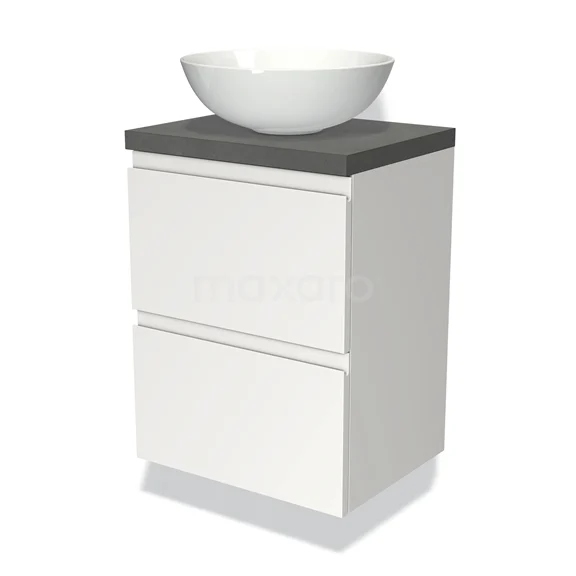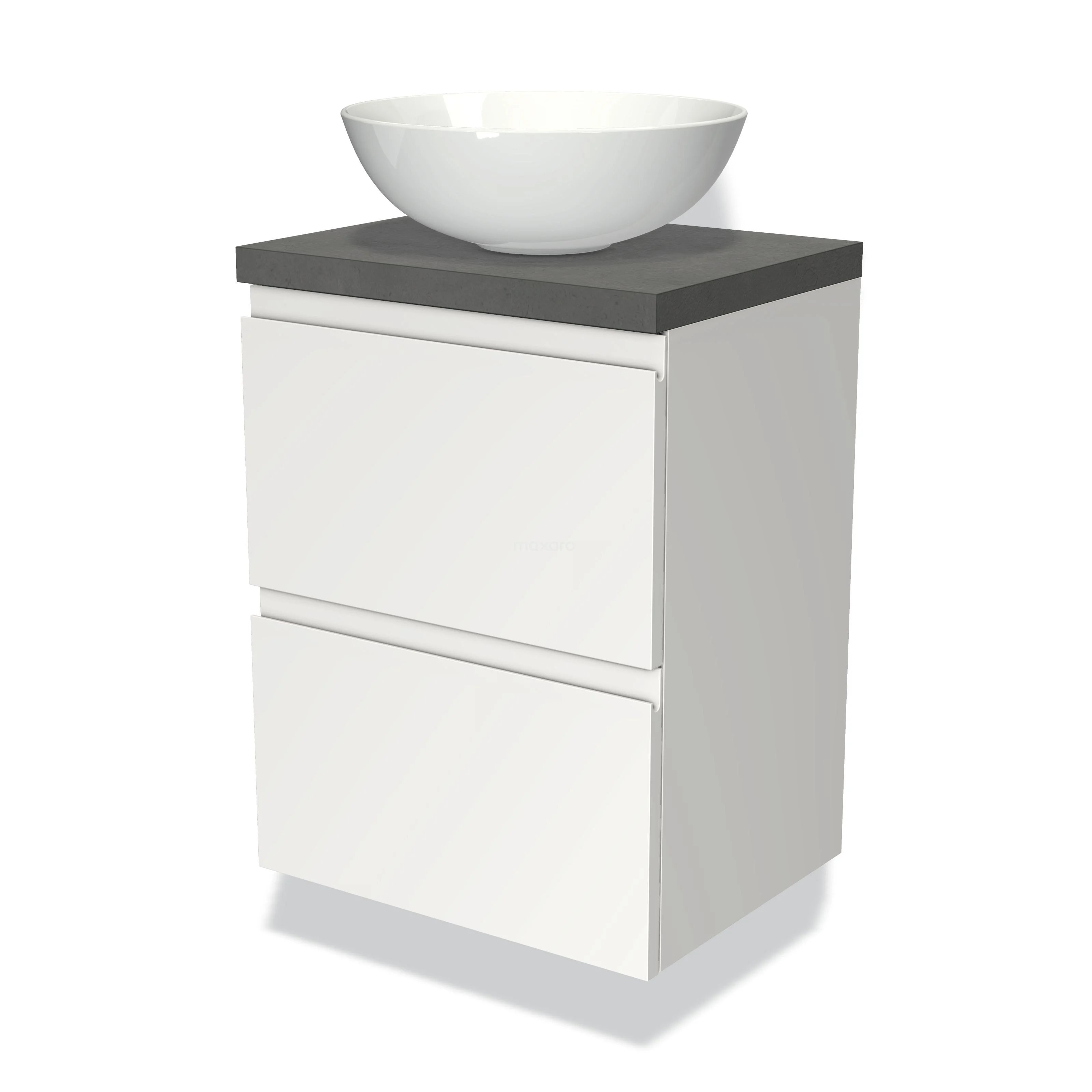 Modulo Plato Slim Badmöbel mit Aufsatzwaschbecken | 50 cm Matt Weiß Grifflos front Dunkelgrauer Beton blatt 2 übereinanderliegende Schubladen