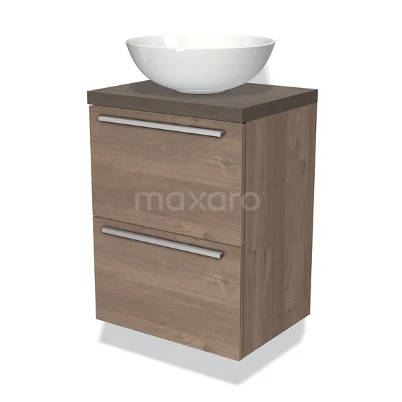 Modulo Plato Slim Badmöbel mit Aufsatzwaschbecken | 50 cm Mittelbraune Eiche Flach front Dunkelbraune Eiche blatt 2 übereinanderliegende Schubladen