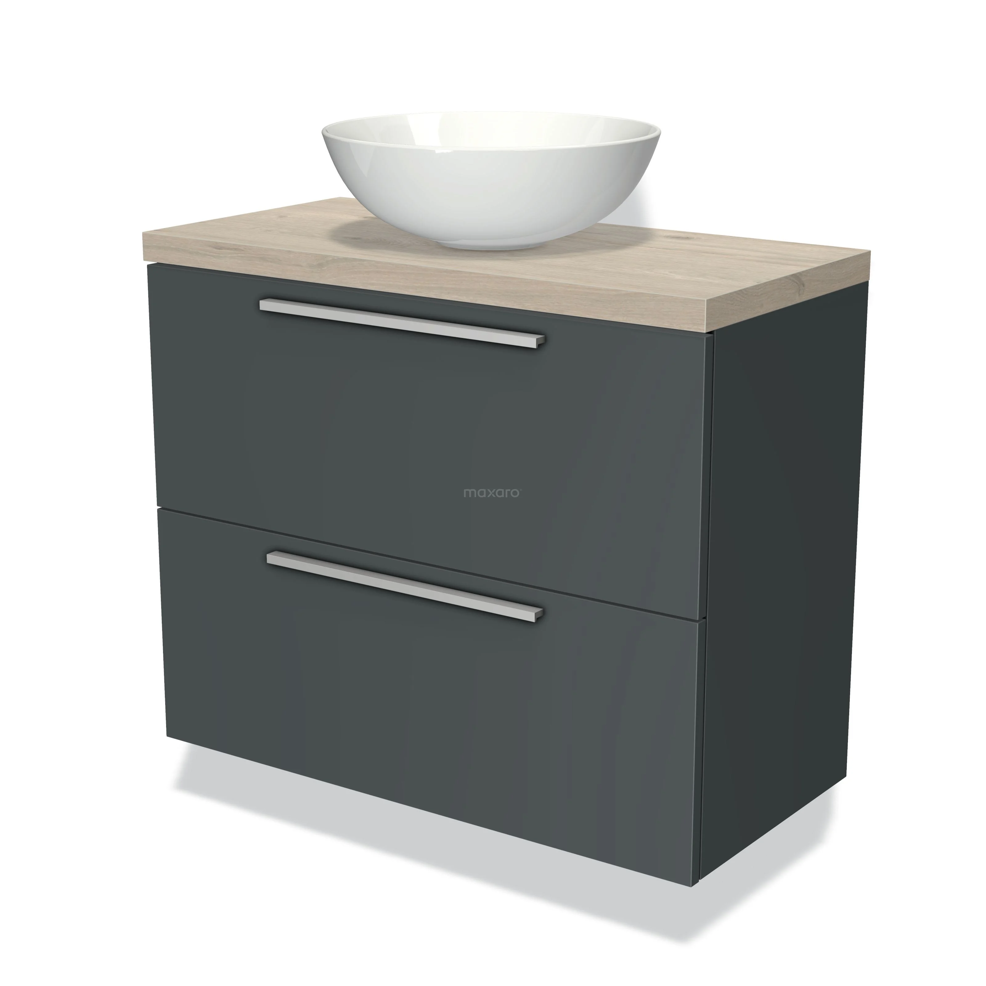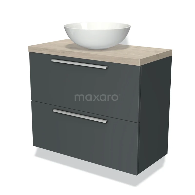 Modulo Plato Slim Badmöbel mit Aufsatzwaschbecken | 80 cm Dunkelgrau Flach front Hellgraue Eiche blatt 2 übereinanderliegende Schubladen