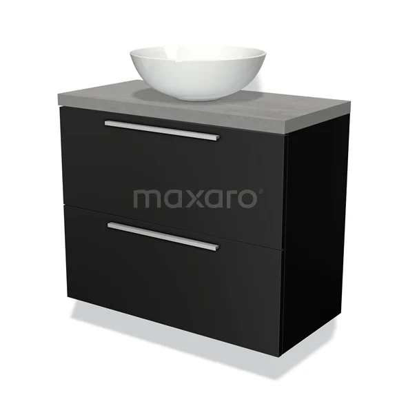 Modulo Plato Slim Badmöbel mit Aufsatzwaschbecken | 80 cm Matt Schwarz Flach front Hellgrauer Beton blatt 2 übereinanderliegende Schubladen