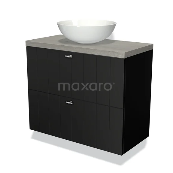 Modulo Plato Slim Badmöbel mit Aufsatzwaschbecken | 80 cm Matt Schwarz Lamelle front Graue Eiche blatt 2 übereinanderliegende Schubladen