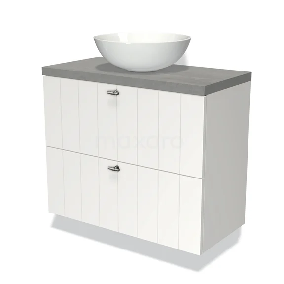 Modulo Plato Slim Badmöbel mit Aufsatzwaschbecken | 80 cm Matt Weiß Lamelle front Hellgrauer Beton blatt 2 übereinanderliegende Schubladen