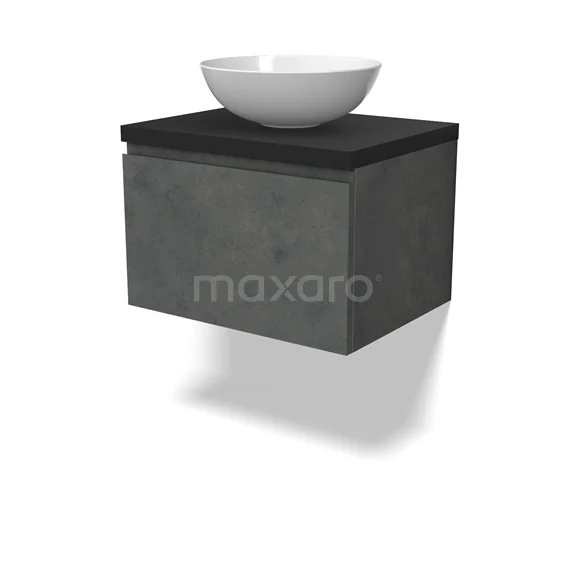 Modulo Plato Badmöbel mit Aufsatzwaschbecken | 60 cm Dunkelgrauer Beton Grifflos front Matt Schwarz blatt 1 Schublade